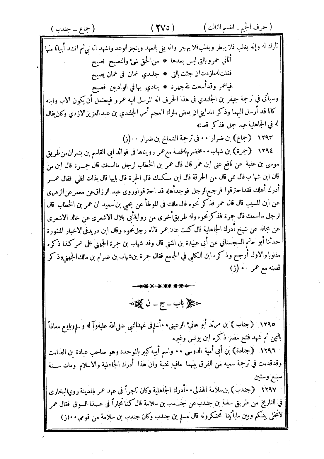 <275> تارك له وأنه يغلب فلا يبطر ويغلب فلا يهجر وأنه يفي بالعهد وينجز الوعد وأشهد أنه نبي ثم أنشد أبياتا منها أتاني عمرو بالتي ليس بعدها من الحق شيء والنصيح نصيح فقلت له ما زدت أن جئت بالتي جلندى عمان في عمان يصيح فيا عمرو قد أسلمت لله جهرة ينادي بها في الواد بين فصيح وسيأتي في ترجمة جيفر بن الجلندي في هذا الحرف أنه المرسل إليه عمرو فيحتمل أن يكون الأب وابنه كانا قد أرسل إليهما وذكر المدائني أن بعض ملوك العجم أمر الجلندي بن عبد العزيز الأزدي وكان يقال له في الجاهلية عبد جمل فذكر قصته جماع بن ضرار في ترجمة الشماخ بن ضرار جمرة بن شهاب مخضرم له قصة مع عمر رويناها في فوائد أبي القاسم بن بشران من طريق موسى بن عقبة عن نافع عن بن عمر قال قال عمر بن الخطاب لرجل ما اسمك قال جمرة قال بن من قال بن شهاب قال ممن قال من الحرقة قال أين مسكنك قال الحرة قال بأيها قال بذات لظى فقال عمر أدرك أهلك فقد احترقوا فرجع الرجل فوجد أهله قد احترقوا وروى عبد الرزاق عن معمر عن الزهري عن بن المسيب قال قال عمر فذكر نحوه قال مالك في الموطأ عن يحيى بن سعيد أن عمر بن الخطاب قال لرجل ما اسمك قال جمرة فذكره نحوه وله طريق أخرى من رواية أبي بلال الأشعري عن خالد الأشعري عن مجالد عن شيخ أدرك الجاهلية قال كنت عند عمر فأتاه رجل نحوه وقال بن دريد في الأخبار المنثورة حدثنا أبو حاتم السجستاني عن أبي عبيدة بن المثنى قال وفد شهاب بن جمرة الجهني على عمر كذا ذكره مقلوبا والأول أرجح وذكره بن الكلبي في الجامع فقال جمرة بن شهاب بن ضرام بن مالك الجهني وذكر قصته مع عمر الجيم بعدها النون جناب بن مرثد أبو هانئ الرعيني أسلم في عهد النبي صلى الله عليه وسلم وبايع معاذا باليمن ثم شهد فتح مصر ذكره بن يونس وغيره جنادة بن أبي أمية الدوسي واسم أبيه كبير بالموحدة وهو صاحب عبادة بن الصامت وقد قدمت في ترجمة سميه من الفرق بينهما ما فيه غنية وأن هذا أدرك الجاهلية والإسلام ومات سنة سبع وستين جندب بن سلامة الهذلي أدرك الجاهلية وكان تاجرا في عهد عمر بالمدينة روى البخاري في التاريخ من طريق سلمة بن جندب عن جندب بن سلامة قال كنا تجارا في هذا السوق فقال عمر لا نخلي بينكم وبين ما يأتينا يحتكرونه قال مسلم بن جندب وكان جندب بن سلامة من قومي §