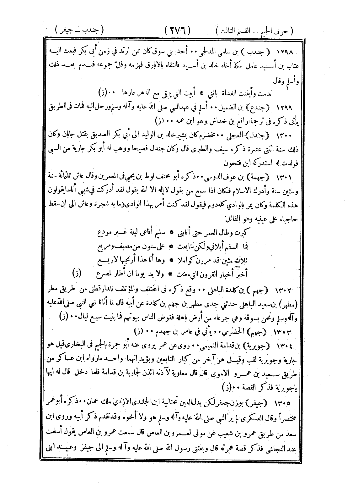 <276> جندب بن سلمى المدلجي أحد بني سوق كان ممن ارتد في زمن أبي بكر فبعث إليه عتاب بن أسيد عامل مكة أخاه خالد بن أسيد فالتقاه في الأبارق فهزمه وفل جموعه فندم بعد ذلك وأسلم وقال ندمت وأيقنت الغداة بأنني أبيت التي يبقى مع الدهر عارها جندع بن الصميل أسلم في عهد النبي صلى الله عليه وسلم ورحل إليه فمات في الطريق يأتي ذكره في ترجمة رافع بن خداش وهو بن عمه جندل العجلي مخضرم كان بشير خالد بن الوليد إلى أبي بكر الصديق بقتل جابان وكان ذلك سنة اثنتي عشرة ذكره سيف والطبري قال وكان جندل فصيحا ووهب له أبو بكر جارية من السبي فولدت له استدركه بن فتحون الجيم بعدها الهاء جهمة بن عوف الدوسي ذكره أبو مخنف لوط بن يحيى في المعمرين وقال عاش ثلاثمائة سنة وستين سنة وأدرك الإسلام فكان إذا سمع من يقول لا إله الا الله يقول لقد أدركت في شيبي أناسا يقولون هذه الكلمة وكان يمر بالوادي كله دوم فيقول لقد كنت أمر بهذا الوادي وما به شجرة وعاش إلى أن سقط حاجباه على عينيه وهو القائل كبرت وطال العمر حتى أنابني سليم أفاعي ليلة غير مودع فما السقم أبلاني ولكن تتابعت علي سنون من مصيف ومربع ثلاث مئين قد مررن كواملا وها أنا ذا أرتجيها لأربع أخبر أخبار القرون التي مضت ولا بد يوما أن أطار لمصرع جهم بن كلدة الباهلي وقع ذكره في المختلف والمؤتلف للدارقطني من طريق مظهر بن سعيد الباهلي حدثني جدي مظهر بن جهم بن كلدة عن أبيه قال لما أتانا نعي النبي صلى الله عليه وسلم ونحن بسوقة وهي جرعاء من أرض باهلة فقوض الناس بيوتهم فما بنيت سبع ليال جهم الحضرمي يأتي في عامر بن جهدم جويرية بن قدامة التميمي روى عن عمر يروي عنه أبو جمرة بالجيم في البخاري قيل هو جارية وجويرية لقب وقيل هو آخر من كبار التابعين ويؤيد أنهما واحد ما رواه بن عساكر من طريق سعيد بن عمرو الأموي قال قال معاوية لآذنه ائذن لجارية بن قدامة فلما دخل قال له أيها يا جويرية فذكر القصة جيفر بوزن جعفر لكن بدل العين تحتانية بن الجلندي الأزدي ملك عمان ذكره أبو عمر مختصرا وقال العسكري لم ير النبي صلى الله عليه وسلم هو ولا أخوه وقد تقدم ذكر أبيه وروى بن سعد من طريق عمرو بن شعيب عن مولى لعمرو بن العاص قال سمعت عمرو بن العاص يقول أسلمت عند النجاشي فذكر قصة هجرته قال وبعثني رسول الله صلى الله عليه وسلم إلى جيفر وعبيد ابني §