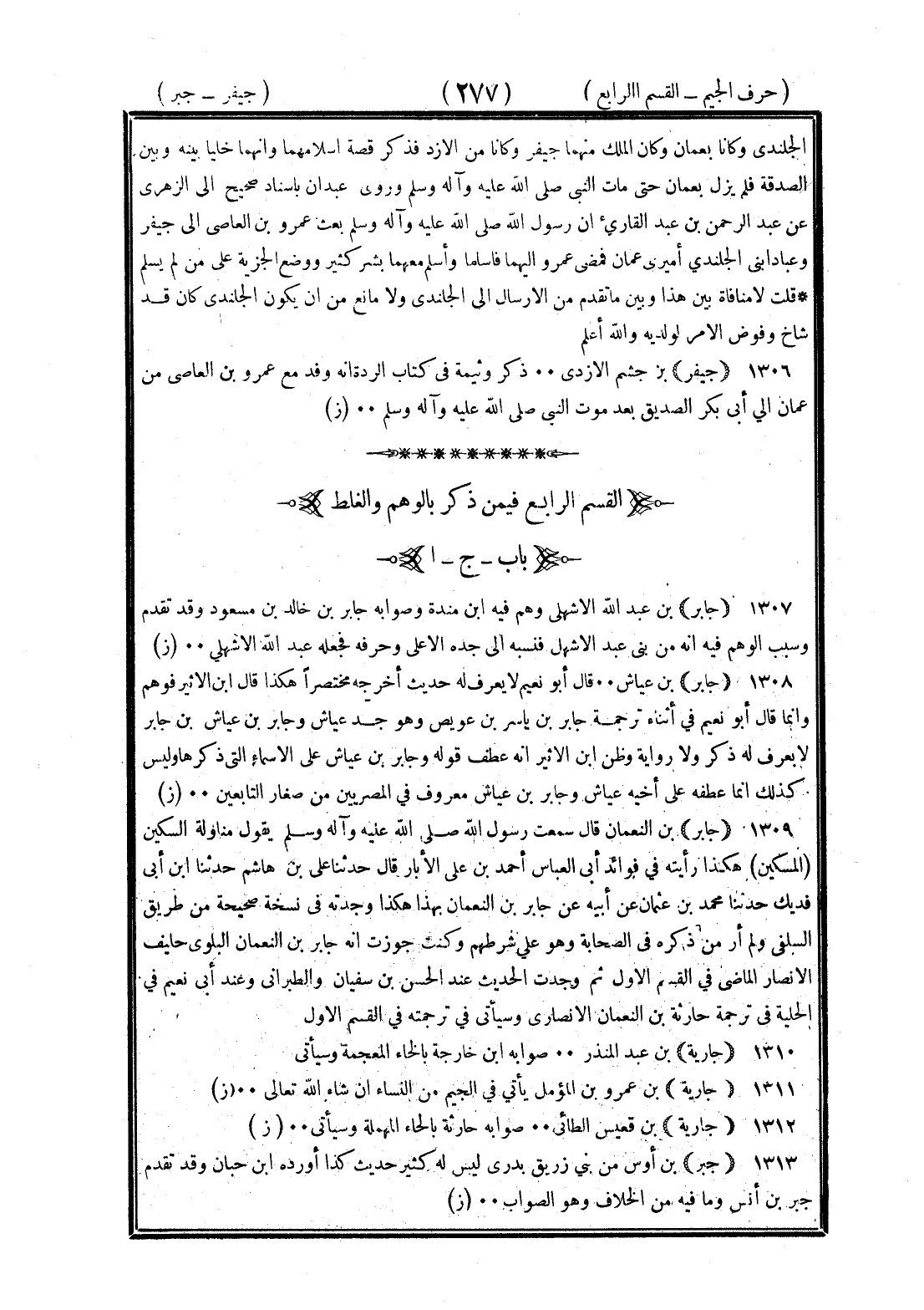 جابر بن عبد الله الأشهلي وهم فيه بن منده وصوابه جابر بن خالد بن مسعود وقد تقدم وسبب الوهم فيه أنه من بني عبد الأشهل فنسبه إلى جده الأعلى وحرفه فجعله عبد الله الأشهلي جابر بن عياش قال أبو نعيم لا يعرف له حديث أخرجه مختصرا هكذا قال بن الأثير فوهم وإنما قال أبو نعيم في أثناء ترجمة جابر بن ياسر بن عويص وهو جد عياش وجابر ابني عياش بن جابر لا يعرف له ذكر ولا رواية وظن بن الأثير أنه عطف قوله وجابر بن عياش على الأسماء التي ذكرها وليس كذلك إنما عطفه على أخيه عياش وجابر بن عياش معروف في المصريين من صغار التابعين جابر بن النعمان قال سمعت رسول الله صلى الله عليه وسلم يقول مناولة المسكين هكذا رأيته في فوائد أبي العباس أحمد بن علي الأبار قال حدثنا علي بن هاشم حدثنا بن أبي فديك حدثنا محمد بن عثمان عن أبيه عن جابر بن النعمان بهذا هكذا وجدته في نسخة صحيحة من طريق السلفي ولم أر من ذكره في الصحابة وهو شرطهم وكنت جوزت أنه جابر بن النعمان البلوي حليف الأنصار الماضي في القسم الأول ثم وجدت الحديث عند الحسن بن سفيان والطبراني وعند أبي نعيم في الحلية في ترجمة حارثة بن النعمان الأنصاري وسيأتي في ترجمته في القسم الأول جارية بن عبد المنذر صوابه بن خارجة بالخاء المعجمة وسيأتي جارية بن عمرو بن المؤمل يأتي في الجيم من النساء إن شاء الله تعالى جارية بن قعيس الطائي صوابه حارثة بالحاء المهملة وسيأتي الجيم بعدها الباء جبر بن أوس من بني زريق بدري ليس له كثير حديث كذا أورده بن حبان وقد تقدم جزء بن أنس وما فيه من الخلاف وهو الصواب §