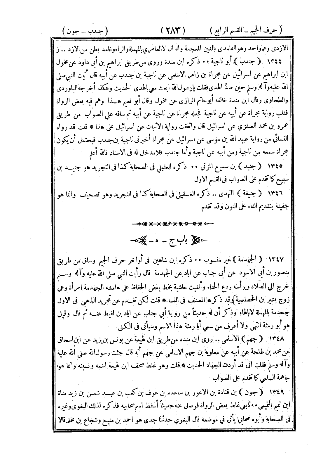 <283> الأزدي وهما واحد وهو الغامدي بالغين المعجمة والدال لا العامري بالمهملة والراء وغامد بطن من الأزد جندب أبو ناجية ذكره بن منده وروى من طريق إبراهيم بن أبي داود عن مخول بن إبراهيم عن إسرائيل عن مجزأة بن زاهر الأسلمي عن ناجية بن جندب عن أبيه قال أتيت النبي صلى الله عليه وسلم حين صد الهدي فقلت يا رسول الله ابعث معي بالهدي الحديث وهكذا أخرجه الباوردي والطحاوي وقال بن منده خالفه أبو حاتم الرازي عن مخول وقال أبو نعيم هذا وهم فيه بعض الرواة فقلب رواية مجزاة عن أبيه عن ناجية فجعله مجزأة عن ناجية عن أبيه ثم ساقه على الصواب من طريق عمرو بن محمد العنقزي عن إسرائيل قال واتفقت رواية الأثبات عن إسرائيل على هذا قلت قد رواه النسائي من رواية عبيد الله بن موسى عن إسرائيل عن مجزأة أخبرني ناجية بن جندب فيحتمل أن يكون مجزأة سمعه من ناجية ومن أبيه عن ناجية وأما جندب فلا مدخل له في الإسناد فالله أعلم جنيد بن سميع المزني ذكره العقيلي في الصحابة كذا في التجريد هو جنيد بن سبيع كما تقدم على الصواب في القسم الأول جنيفة النهدي ذكره العقيلي في الصحابة كذا في التجريد وهو تصحيف وإنما هو جفينة بتقديم الفاء على النون وقد تقدم الجيم بعدها الهاء الجهدمة غير منسوب ذكره بن شاهين في أواخر حرف الجيم وساق من طريق منصور بن أبي الأسود عن أبي جناب عن إياد عن الجهدمة قال رأيت النبي صلى الله عليه وسلم خرج إلى الصلاة وبرأسه ردع الحناء وألفيت حاشيه بخط بعض الحفاظ على هامشه الجهدمة امرأة وهي زوج بشير بن الخصاصية وقد ذكرها المصنف في النساء لكن تقدم عن تجريد الذهبي في الأول جحدمة بالمهملة لا بالهاء وذكر أن له حديثا من رواية أبي جناب عن إياد بن لقيط عنه ثم قال وقيل هو أبو رمثة انتهى ولا أعرف من سمي أبا رمثة هذا الاسم وسيأتي في الكنى جهم الأسلمي روى بن منده من طريق بن لهيعة عن يونس بن يزيد عن أبي إسحاق عن محمد بن طلحة عن أبيه عن معاوية بن جهم الأسلمي عن جهم أنه قال جئت رسول الله صلى الله عليه وسلم فقلت إني قد أردت الجهاد الحديث قلت وهو غلط صحف بن لهيعة اسمه ونسبته وإنما هو جاهمة السلمي كما تقدم على الصواب الجيم بعدها الواو جون بن قتادة بن الأعور بن ساعدة بن عوف بن كعب بن عبد شمس بن زيد مناة بن تميم التميمي تابعي غلط بعض الرواة فوصل عنه حديثا أسقط اسم صحابية فذكره لذلك البغوي وغيره في الصحابة وأبوه صحابي يأتي في موضعه قال البغوي حدثنا جدي هو أحمد بن منيع وشجاع بن مخلد قالا §