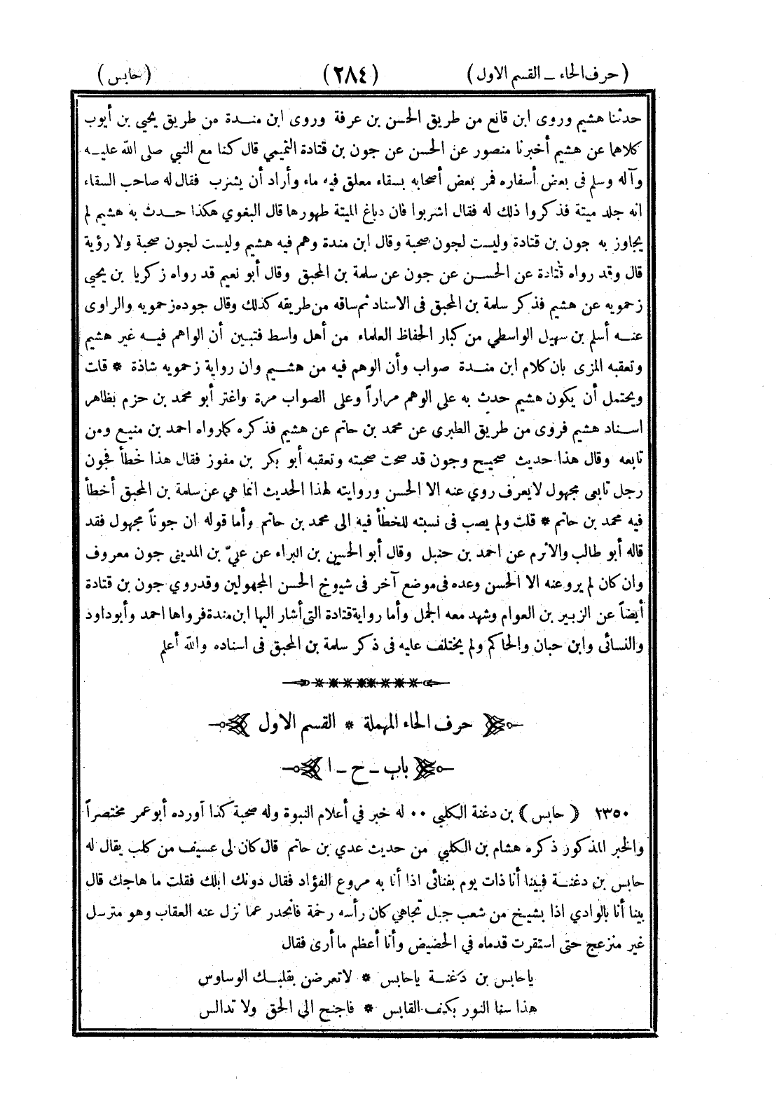 <284> حدثنا هشيم وروى بن قانع من طريق الحسن بن عرفة وروى بن منده من طريق يحيى بن أيوب كلاهما عن هشيم أخبرنا منصور عن الحسن عن جون بن قتادة التميمي قال كنا مع النبي صلى الله عليه وسلم في بعض أسفاره فمر بعض أصحابه بسقاء معلق فيه ماء وأراد أن يشرب فقال له صاحب السقاء إنه جلد ميتة فذكروا ذلك له فقال اشربوا فإن دباغ الميتة طهورها قال البغوي هكذا حدث به هشيم لم يجاوز به جون بن قتادة وليست لجون صحبة وقال بن منده وهم فيه هشيم وليست لجون صحبة ولا رؤية قال وقد رواه قتادة عن الحسن عن جون عن سلمة بن المحبق وقال أبو نعيم قد رواه زكريا بن يحيى بن زحمويه عن هشيم فذكر سلمة بن المحبق في الإسناد ثم ساقه من طريقه كذلك وقال جوده زحمويه والراوي عنه أسلم بن سهيل الواسطي من كبار الحفاظ العلماء من أهل واسط فتبين أن الواهم فيه غير هشيم وتعقبه المزي بأن كلام بن منده صواب وأن الوهم فيه من هشيم وأن رواية زحمويه شاذة قلت ويحتمل أن يكون هشيم حدث به على الوهم مرارا وعلى الصواب مرة واغتر أبو محمد بن حزم بظاهر إسناد هشيم فروى من طريق الطبري عن محمد بن حاتم عن هشيم فذكره كما رواه أحمد بن منيع ومن تابعه وقال هذا حديث صحيح وجون قد صحت صحبته وتعقبه أبو بكر بن معوز فقال هذا خطأ فجون رجل تابعي مجهول لا يعرف روى عنه الا الحسن وروايته لهذا الحديث إنما هي عن سلمة بن المحبق أخطأ فيه محمد بن حاتم قلت ولم يصب في نسبته للخطأ فيه إلى محمد بن حاتم وأما قوله أن جونا مجهول فقد قاله أبو طالب والأثرم عن أحمد بن حنبل وقال أبو الحسن بن البراء عن علي بن المديني جون معروف وإن كان لم يرو عنه الا الحسن وعده في موضع آخر في شيوخ الحسن المجهولين وقد روى جون بن قتادة أيضا عن الزبير بن العوام وشهد معه الجمل وأما رواية قتادة التي أشار إليها بن منده فرواها أحمد وأبو داود والنسائي وابن حبان والحاكم ولم يختلف عليه في ذكر سلمة بن المحبق في إسناده والله أعلم