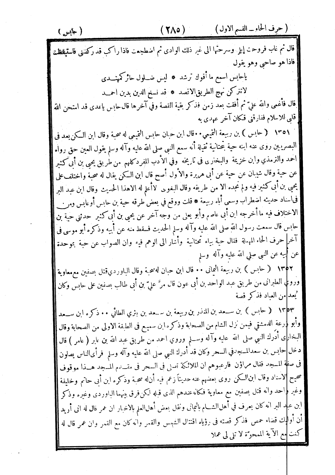 <285> قال ثم غاب فروحت إبلي وسرحتها إلى غير ذلك الوادي ثم اضطجعت فإذا راكب قد ركضني فاستيقظت فإذا هو صاحبي وهو يقول يا حابس أسمع ما أقول ترشد ليس ضلول حائر كمهتدي لا تتركن نهج الطريق الأقصد قد نسخ الدين بدين أحمد قال فأعمى والله علي ثم أفقت بعد زمن فذكر بقية القصة وفي آخرها قال حابس يا عدي قد امتحن الله قلبي للإسلام ففارقني فكان آخر عهدي حابس بن ربيعة التميمي قال بن حبان حابس التميمي له صحبة وقال بن السكن يعد في البصريين روى عنه ابنه حية بتحتانية ثقيلة أنه سمع النبي صلى الله عليه وسلم يقول العين حق رواه أحمد والترمذي وابن خزيمة والبخاري في تاريخه وفي الأدب المفرد كلهم من طريق يحيى بن أبي كثير عن حية وقال شيبان عن يحيى عن حية عن أبي هريرة والأول أصح قال بن السكن يقال له صحبة واختلف على يحيى بن كثير فيه ولم نجده الا من طريقه وقال البغوي لا أعلم له الا هذا الحديث وقال بن عبد البر في إسناد حديثه اضطراب وسمي أباه ربيعة قلت ووقع في بعض طرقه حية بن حابس أو عابس ومن الاختلاف فيه ما أخرجه بن أبي عاصم وأبو يعلى من وجه آخر عن يحيى بن أبي كثير حدثني حية بن حابس قال سمعت رسول الله صلى الله عليه وسلم الحديث فسقط منه عن أبيه وذكره أبو موسى في آخر حرف الحاء المهملة فقال حية بياء تحتانية وأشار إلى الوهم فيه وأن الصواب عن حبة بموحدة عن أبيه عن النبي صلى الله عليه وسلم حابس بن ربيعة اليماني قال بن حبان له صحبة وقال الباوردي قتل بصفين مع معاوية وروى الطبراني من طريق عبد الواحد بن أبي عون قال مر علي بن أبي طالب بصفين على حابس وكان يعد من العباد فذكر قصة حابس بن سعد بن المنذر بن ربيعة بن سعد بن يثربي الطائي ذكره بن سعد وأبو زرعة الدمشقي فيمن نزل الشام من الصحابة وذكره بن سميع في الطبقة الأولى من الصحابة وقال البخاري أدرك النبي صلى الله عليه وسلم وروى أحمد من طريق عبد الله بن غابر قال دخل حابس بن سعد المسجد في السحر وكان قد أدرك النبي صلى الله عليه وسلم فرأى الناس يصلون في صفة المسجد فقال مراءون فأرعبوهم إن الملائكة تصلي من السحر في مقدم المسجد قذا موقوف صحيح الإسناد وقال بن السكن روى بعضهم عنه حديثا زعم فيه أن له صحبة وذكره بن أبي حاتم وخليفة وغير واحد وأنه قتل بصفين مع معاوية فكأنه عندهم الذي قبله لكن فرق بينهما الباوردي وغيره وذكر بن عبد البر أنه يعرف في أهل الشام باليماني ونقل بعض أهل العلم بالأخبار أن عمر قال له إني أريد أن اوليك قضاء حمص فذكر قصة في رؤياه اقتتال الشمس والقمر وأنه كان مع القمر وأن عمر قال له كنت مع الآية الممحوة لا تلي لي عملا §
