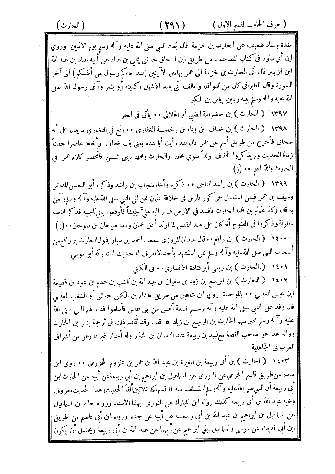 <291> منده بإسناد ضعيف عن الحارث بن خزمة قال بعث النبي صلى الله عليه وسلم يوم الإثنين وروى بن أبي داود في كتاب المصاحف من طريق بن إسحاق حدثني يحيى بن عباد عن أبيه عباد بن عبد الله بن الزبير قال أتى الحارث بن خزمة إلى عمر بهاتين الآيتين لقد جاءكم رسول من أنفسكم إلى آخر السورة وقال الطبراني كان من القواقلة وحالف بني عبد الأشهل وكنيته أبو بشر وآخى رسول الله صلى الله عليه وسلم بينه وبين إياس بن البكير الحارث بن خضرامة الضبي أو الهلالي يأتي في الحر الحارث بن خفاف بن إيماء بن رحضة الغفاري وقع في البخاري ما يدل على أنه صحابي فأخرج من طريق أسلم عن عمر قال لقد رأيت أبا هذه يعني بنت خفاف وأخوها حاصرا حصنا زمانا الحديث ولم يذكروا لخفاف ولدا سوى مخلد والحارث ومخلد تابعي شهير فانحصر كلام عمر في الحارث والله أعلم الحارث بن راشد الناجي ذكره وأخاه منجاب بن راشد أبو الحسن المدائني وسيف بن عمر فيمن استعمل على كور فارس في خلافة عثمان ممن لقي النبي صلى الله عليه وسلم وآمن به قال وكانا عثمانيين فأما الحارث فأفسد في الأرض فسير إليه علي جيشا فأوقعوا ببني ناجية فذكر القصة مطولة وذكروا في الفتوح أنه كان على عبد القيس لما ارتد أهل عمان ومعه صيحان بن صوحان الحارث بن رافع قال عبدان المروزي سمعت أحمد بن سيار يقول الحارث بن رافع من أصحاب النبي صلى الله عليه وسلم ممن استشهد بأحد لا يعرف له حديث استدركه أبو موسى الحارث بن ربعي أبو قتادة الأنصاري في الكنى الحارث بن الربيع بن زياد بن سفيان بن عبد الله بن ناشب بن هدم بن عوذ بن قطيعة بن عبس العبسي بالموحدة روى بن شاهين من طريق هشام بن الكلبي حدثني أبو الشغب العبسي قال وفد على النبي صلى الله عليه وسلم تسعة أنفس من بني عبس فأسلموا فدعا لهم النبي صلى الله عليه وسلم بخير منهم الحارث بن الربيع بن زياد قلت وقد تقدم ذلك في ترجمة بشر بن الحارث ووالد هذا هو صاحب القصة مع لبيد بن ربيعة عند النعمان بن المنذر وله أخبار غيرها وهو من أشراف العرب في الجاهلية الحارث بن أبي ربيعة بن المغيرة بن عبد الله بن عمر بن مخزوم المخزومي روى بن منده من طريق قاسم الجرمي عن الثوري عن إسماعيل بن إبراهيم بن أبي ربيعة عن أبيه عن الحارث بن أبي ربيعة أن النبي صلى الله عليه وسلم استسلف منه لما قدم مكة ثلاثين ألفا الحديث وهذا الحديث معروف بأخيه عبد الله بن أبي ربيعة كذلك رواه بن المبارك عن الثوري بهذا الإسناد ورواه حاتم بن إسماعيل عن إسماعيل بن إبراهيم بن عبد الله بن أبي ربيعة عن أبيه عن جده ورواه بن أبي عاصم من طريق بن أبي فديك عن موسى وإسماعيل ابني إبراهيم عن أبيهما عن عبد الله بن أبي ربيعة ويحتمل أن يكون §