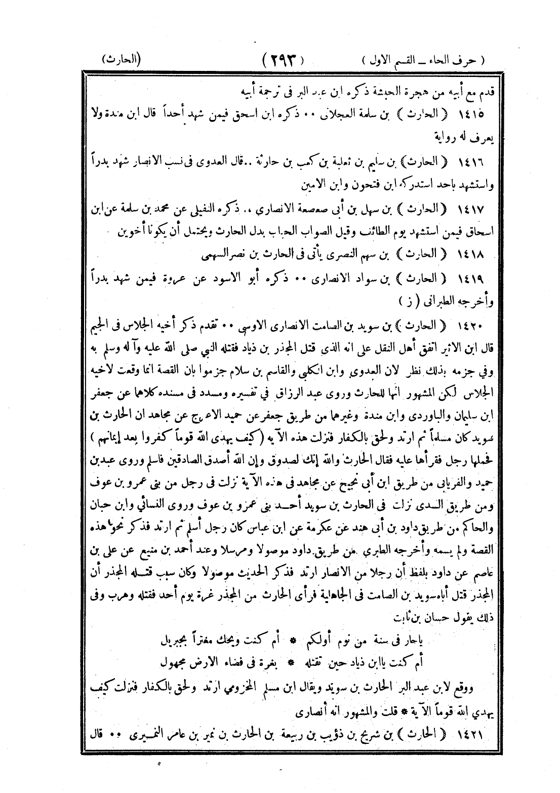 <293> قدم مع أبيه من هجرة الحبشة ذكره بن عبد البر في ترجمة أبيه الحارث بن سلمة العجلاني ذكره بن إسحاق فيمن شهد أحدا قال بن منده ولا يعرف له رواية الحارث بن سليم بن ثعلبة بن كعب بن حارثة قال العدوي في نسب الأنصار شهد بدرا واستشهد بأحد استدركه بن فتحون وابن الأمين الحارث بن سهل بن أبي صعصعة الأنصاري ذكره النفيلي عن محمد بن سلمة عن بن إسحاق فيمن استشهد يوم الطائف وقيل الصواب الحباب بدل الحارث ويحتمل أن يكونا أخوين الحارث بن سهم النصري يأتي في الحارث بن نصر السهمي الحارث بن سواد الأنصاري ذكره أبو الأسود عن عروة فيمن شهد بدرا وأخرجه الطبراني الحارث بن سويد بن الصامت الأنصاري الأوسي تقدم ذكر أخيه الجلاس في الجيم قال بن الأثير اتفق أهل النقل على أنه الذي قتل المجذر بن زياد فقتله النبي صلى الله عليه وسلم به وفي جزمه بذلك نظر لأن العدوي وابن الكلبي والقاسم بن سلام جزموا بأن القصة إنما وقعت لأخيه الجلاس لكن المشهور أنها للحارث وروى عبد الرزاق في تفسيره ومسدد في مسنده كلاهما عن جعفر بن سليمان والباوردي وابن منده وغيرهما من طريق جعفر عن حميد الأعرج عن مجاهد أن الحارث بن سويد كان مسلما ثم ارتد ولحق بالكفار فنزلت هذه الآية كيف يهدي الله قوما كفروا بعد ايمانهم فحملها رجل فقرأها عليه فقال الحارث والله انك لصدوق وإن الله أصدق الصادقين فأسلم وروى عبد بن حميد والفريابي من طريق بن نجيح عن مجاهد في هذه الآية نزلت في رجل من بني عمرو بن عوف ومن طريق السدي نزلت في الحارث بن سويد أحد بني عمرو بن عوف وروى النسائي وابن حبان والحاكم من طريق داود بن أبي هند عن عكرمة عن بن عباس كان رجل أسلم ثم ارتد فذكر نحو هذه القصة ولم يسمه وأخرجه الطبري من طريق داود موصولا ومرسلا وعند أحمد بن منيع عن علي بن عاصم عن داود بلفظ إن رجلا من الأنصار ارتد فذكر الحديث موصولا وكان سبب قتله المجذر أن المجذر قتل أباه سويد بن الصامت في الجاهلية فرأى الحارث من المجذر غرة يوم أحد فقتله وهرب وفي ذلك يقول حسان بن ثابت يا حار في سنة من نوم أولكم أم كنت ويحك مغترا بجبريل أم كنت يا بن زياد حين تقتله بغرة في فضاء الأرض مجهول ووقع لابن عبد البر الحارث بن سويد ويقال بن مسلم المخزومي ارتد ولحق بالكفار فنزلت كيف يهدي الله قوما الآية قلت والمشهور أنه أنصاري الحارث بن شريح بن ذؤيب بن ربيعة بن الحارث بن نمير بن عامر النميري قال §