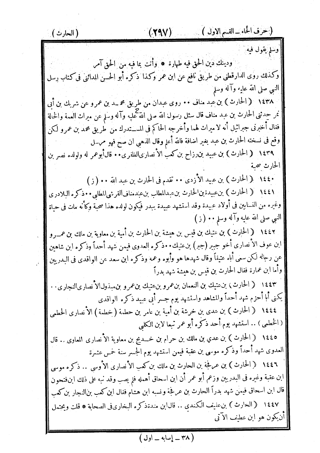 <297> يقول فيه ودينك دين الحق فيه طهارة وأنت بما فيه من الحق آمر وكذا روى الدارقطني من طريق نافع عن بن عمر وكذا ذكره أبو الحسن المدائني في كتاب رسل النبي صلى الله عليه وسلم الحارث بن عبد مناف روى عبدان من طريق محمد بن عمرو عن شريك بن أبي نمر حدثني الحارث بن عبد مناف قال سئل رسول الله صلى الله عليه وسلم عن ميراث العمة والخالة فقال أخبرني جبرائيل أنه لا ميراث لهما وأخرجه الحاكم في المستدرك من طريق محمد بن عمر لكن وقع في نسخته الحارث بن عبد بغير إضافة فالله أعلم وقال الذهبي أن صح فهو مرسل الحارث بن عبيد بن رزاح بن كعب الأنصاري الظفري قال أبو عمر له ولولده نصر بن الحارث صحبة الحارث بن عبيد الأزدي تقدم في الحارث بن عبد الله الحارث بن عبيدة بن الحارث بن عبد المطلب بن عبد مناف القرشي المطلبي ذكره البلاذري وغيره من النسابين في أولاد عبيدة وقد استشهد عبيدة ببدر فيكون لولده هذا صحبة وكأنه مات في حياة النبي صلى الله عليه وسلم الحارث بن عتيك بن قيس بن هيشة بن الحارث بن أمية بن معاوية بن مالك بن عمرو بن عوف الأنصاري أخو جبر والد عتيك بن عتيك ذكره العدوي فيمن شهد أحدا وذكره بن شاهين عن رجاله لكن سمي أباه عتيقا وقال شهدها هو وأبوه وعمه وذكره بن سعد عن الواقدي في البدريين وأما بن عمارة فقال الحارث بن قيس بن هيشة شهد بدرا الحارث بن عتيك بن النعمان بن عمرو بن عتيك بن عمرو بن مبذول الأنصاري النجاري يكنى أبا أحزم شهد أحدا والمشاهد استشهد يوم جسر أبي عبيد ذكره الواقدي الحارث بن عدي بن خرشة بن أمية بن عامر بن خطمة الأنصاري الخطمي استشهد يوم أحد ذكره أبو عمر تبعا لابن الكلبي الحارث بن عدي بن مالك بن حرام بن خديج بن معاوية الأنصاري المعاوي قال العدوي شهد أحدا وذكره موسى بن عقبة فيمن استشهد يوم الجسر سنة خمس عشرة الحارث بن عرفجة بن الحارث بن مالك بن كعب الأنصاري الأوسي ذكره موسى بن عقبة وغيره في البدريين وزعم أبو عمر أن بن إسحاق اهمله فلم يصب وقد نبه على ذلك بن فتحون قال بن إسحاق فيمن شهد بدرا الحارث بن عرفجة ونسبه بن هشام فقال بن كعب بن النجار بن كعب الحارث بن عفيف الكندي قال بن منده ذكره البخاري في الصحابة ويحتمل أن يكون هو بن غطيف الآتي §