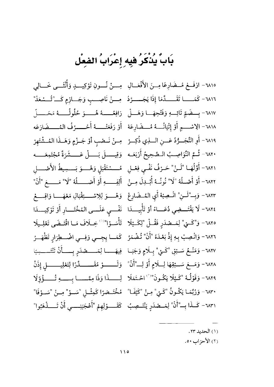 ٦٨١٥ - ارْفَعْ مُضَارِعًا مِنَ الأَفْعَالِ ... مِنْ نُونِ تَوْكِيدٍ وَأُنْثَى خَالِي