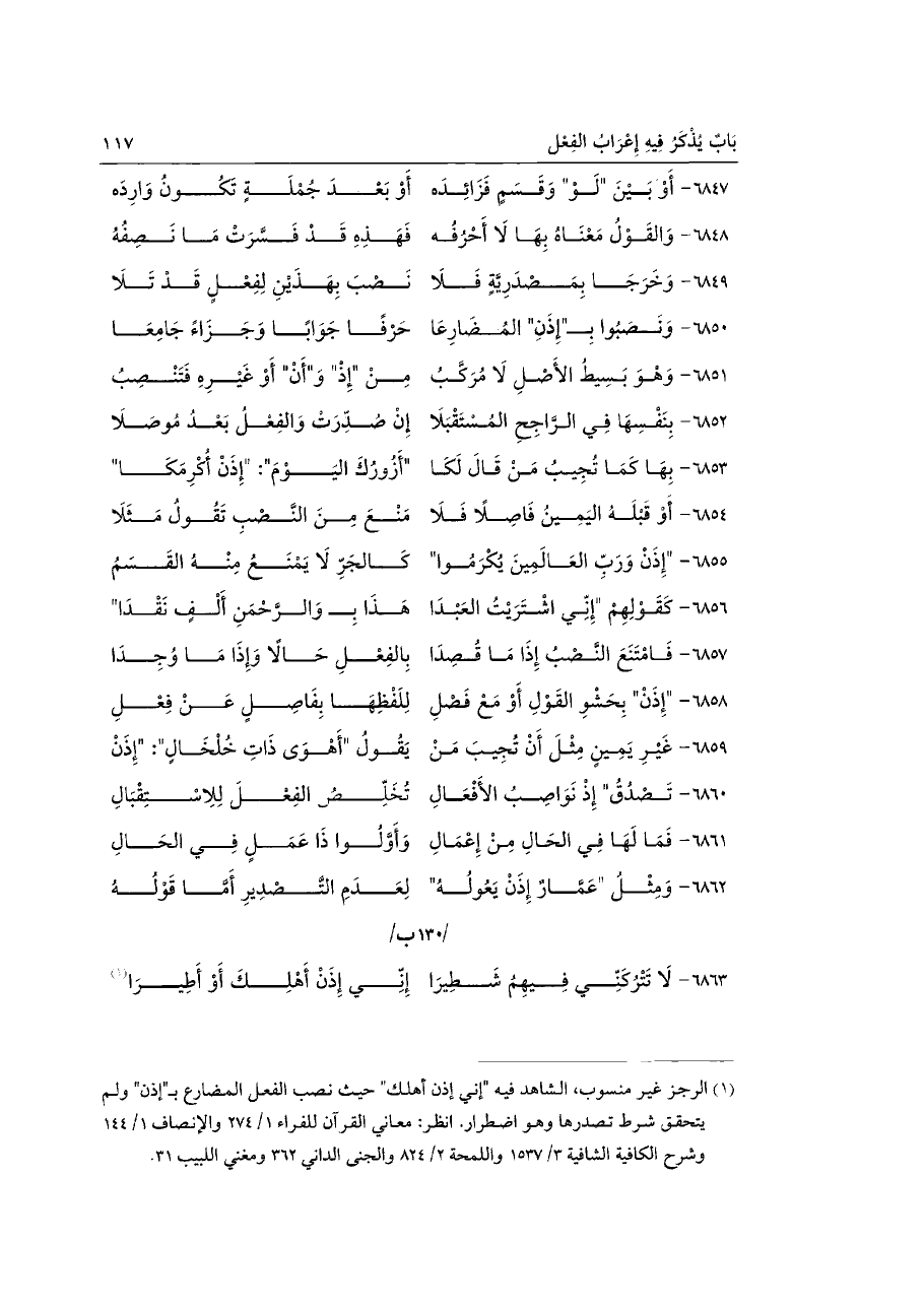 (¬١) الرجز غير منسوب، الشاهد فيه "إني إذن أهلك" حيث نصب الفعل المضارع بـ"إذن" ولم يتحقق شرط تصدرها وهو اضطرار. انظر: معاني القرآن للفراء ١\ ٢٧٤ والإنصاف ١\ ١٤٤ وشرح الكافية الشافية ٣\ ١٥٣٧ واللمحة ٢\ ٨٢٤ والجنى الداني ٣٦٢ ومغني اللبيب ٣١.