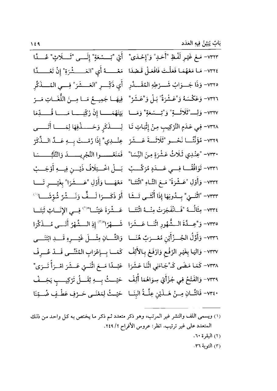 ٧٣٢٧ - وَلِـ"ثَلَاثَةٍ" وَ"تِسْعَةٍ" وَمَا ... بَيْنَهُمَا إِنْ رُكِّبَا مَا قُدِّمَا