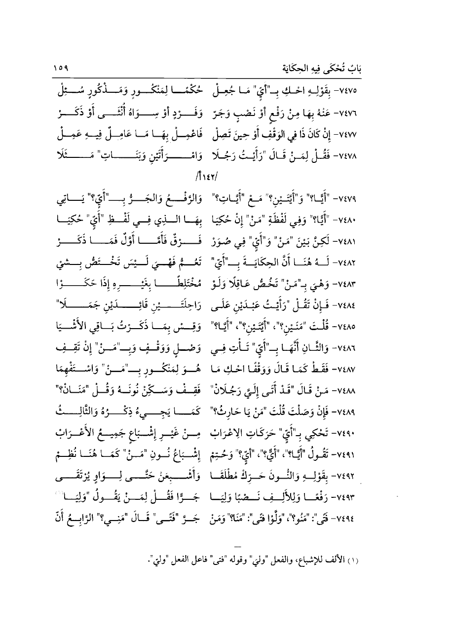 ٧٤٨٠ - "أَيًّا؟ " وَفِي لَفْظَةِ "مَنْ" إِنْ حُكِيَا ... بِهَا الذِي فِي لَفْظِ "أَيٍّ" حُكِيَا