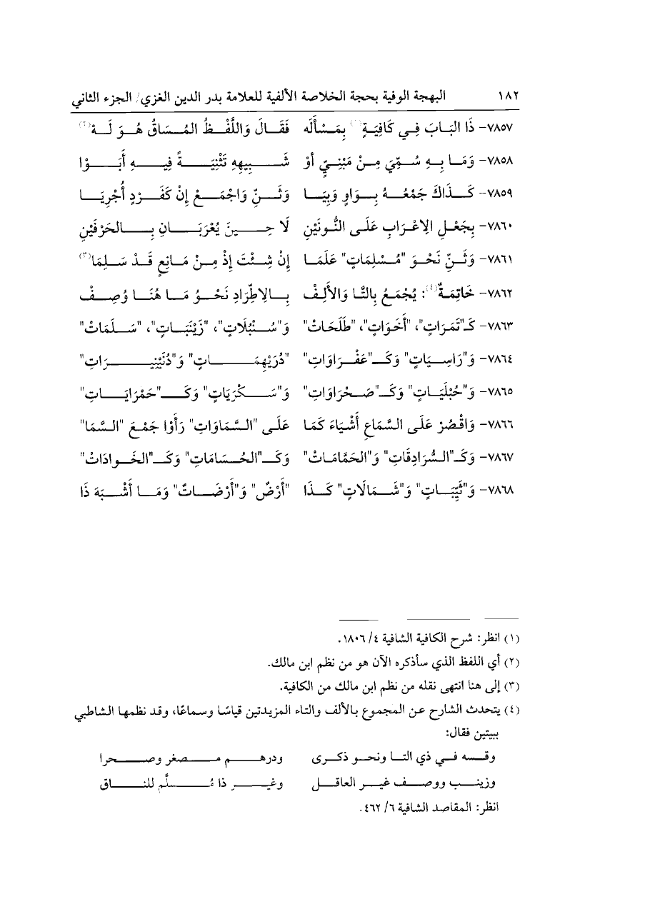 (¬٤) يتحدث الشارح عن المجموع بالألف والتاء المزيدتين قياسًا وسماعًا، وقد نظمها الشاطبي ببيتين فقال:
