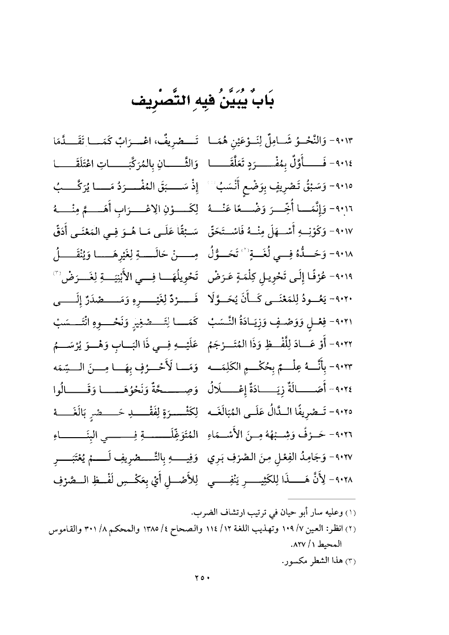 ٩٠١٩ - عُرْفًا إِلَى تَحْوِيلِ كِلْمَةٍ عَرَضْ ... تَحْوِيلُهَا فِي الأَبْنِيَةِ لِغَرَضْ (¬٣)