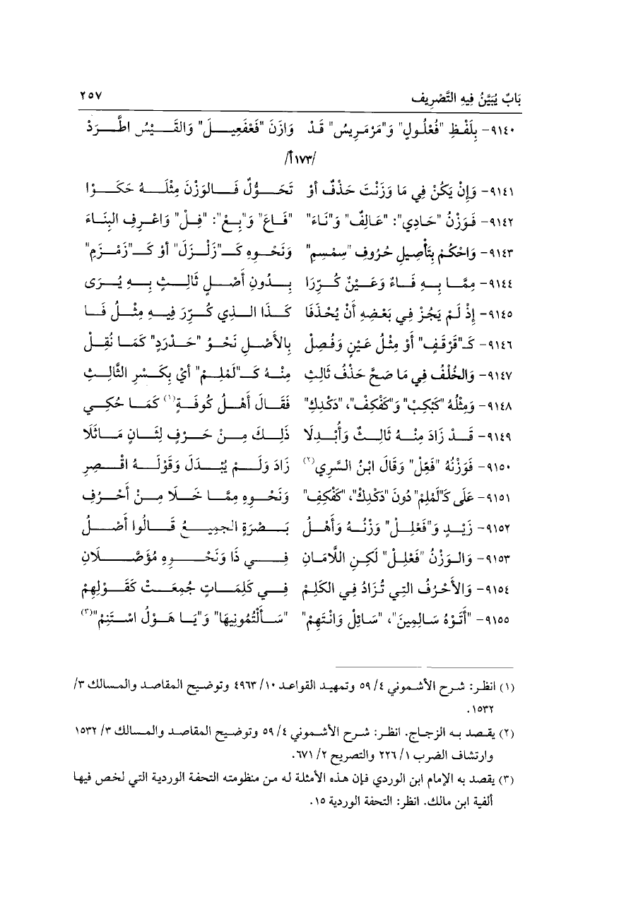 (¬٣) يقصد به الإمام ابن الوردي فإن هذه الأمثلة له من منظومته التحفة الوردية التي لخص فيها ألفية ابن مالك. انظر: التحفة الوردية ١٥.
