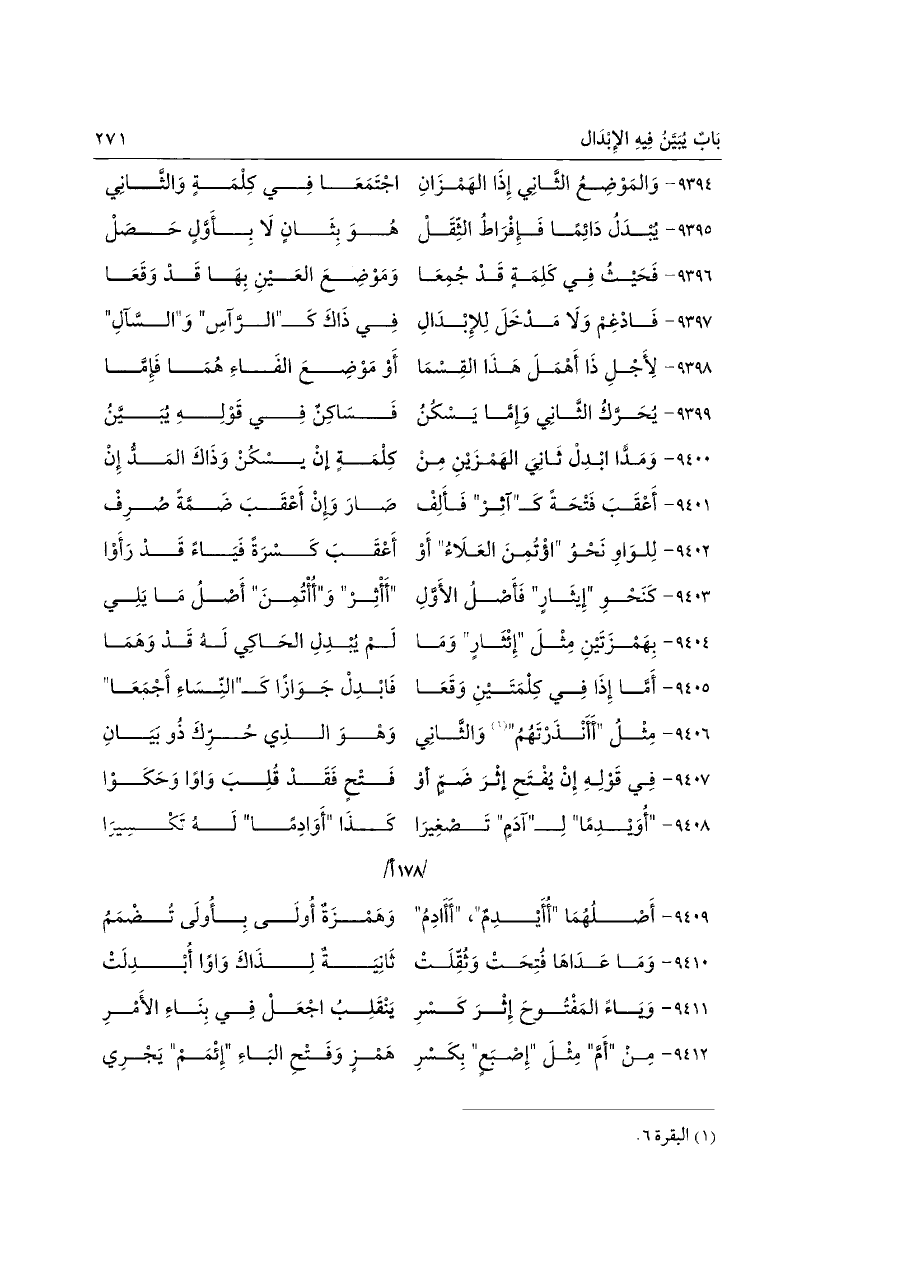 ٩٤٠٠ - وَمَدًّا ابْدِلْ ثَانِيَ الهَمْزَيْنِ مِنْ ... كِلْمَةٍ انْ يَسْكُنْ وَذَاكَ المَدُّ إِنْ