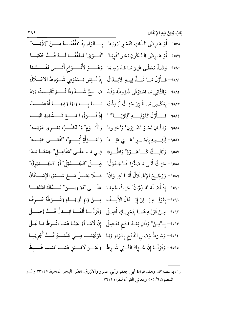٩٥٩١ - بِقَوْلِهِ بَيَّنَ إِبْدَالَ الأَلِفْ ... مِنْ وَاوٍ اوْ يَاءٍ وَشَرْطُهُ عُرِفْ