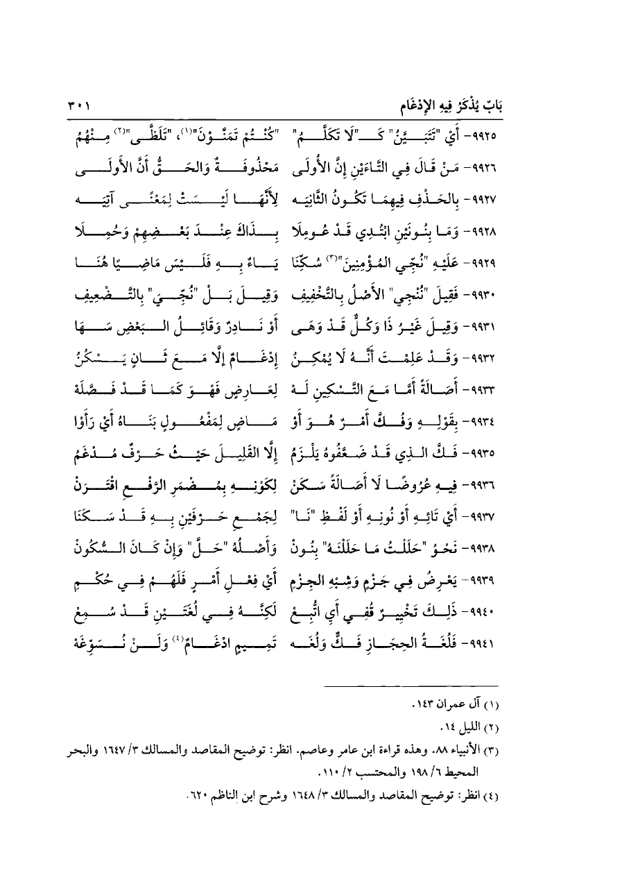 ٩٩٣٠ - فَقِيلَ "نُنْجِي" الأَصْلُ بِالتَّخْفِيفِ ... وَقِيلَ بَلْ "نُجِّيَ" بِالتَّضْعِيفِ