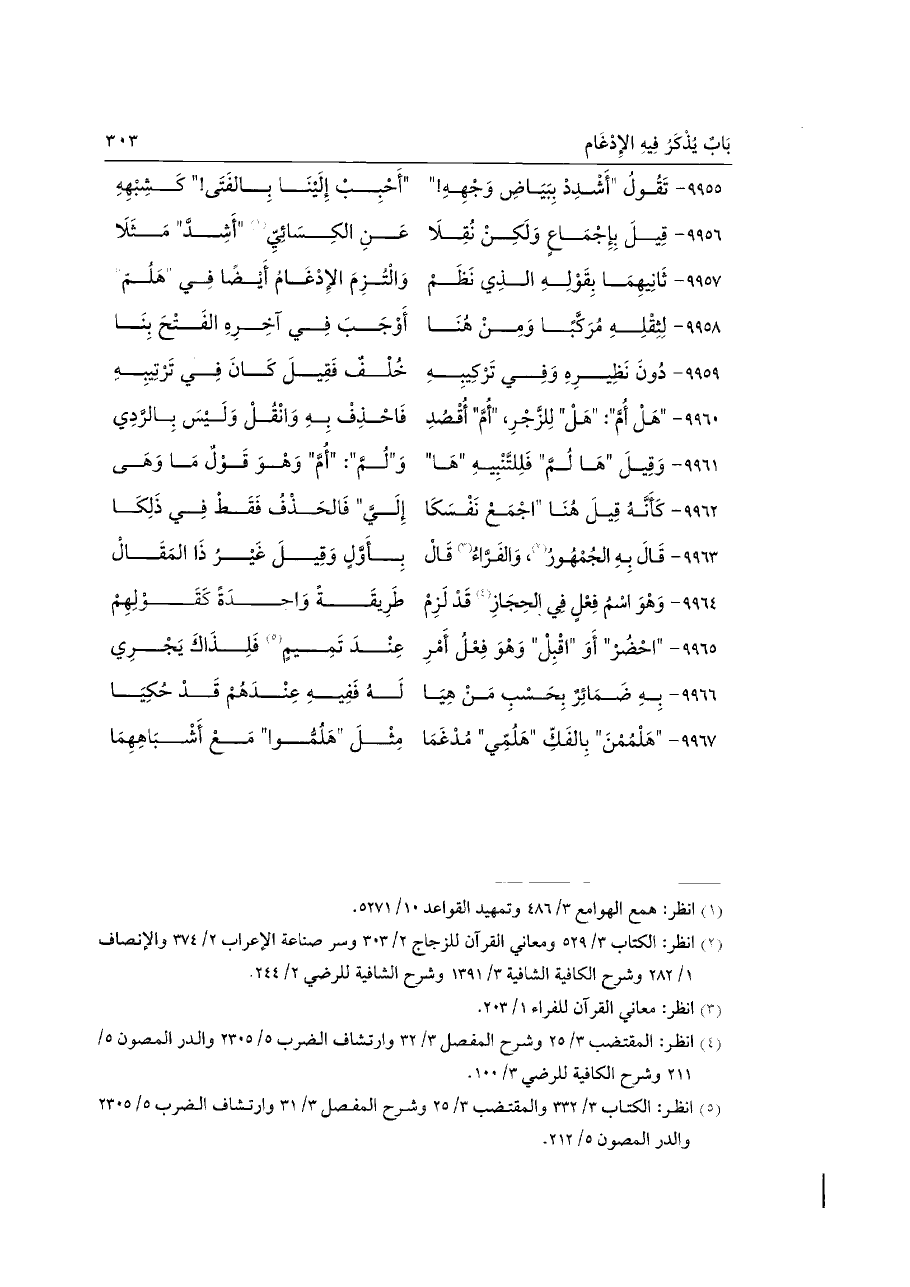 ٩٩٦٧ - "هَلْمُمْنَ" بِالفَكِّ "هَلُمِّي" مُدْغَمَا ... مِثْلَ "هَلُمُّوا" مَعْ أَشْبَاهِهِمَا