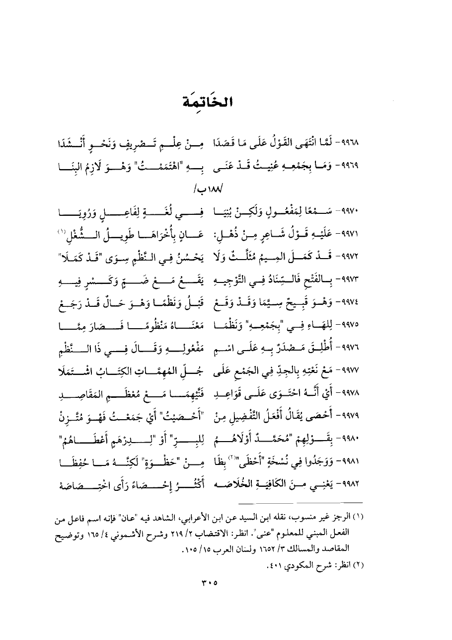 ٩٩٦٨ - لَمَّا انْتَهَى القَوْلُ عَلَى مَا قَصَدَا ... مِنْ عِلْمِ تَصْرِيفٍ وَنَحْوٍ أَنْشَدَا