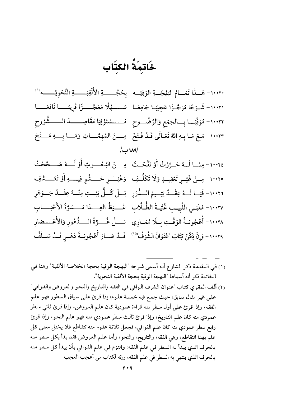 (¬١) في المقدمة ذكر الشارح أنه أسمى شرحه "البهجة الوفية بحجة الخلاصة الألفية" وهنا في الخاتمة ذكر أنه أسماها "البهجة الوفية بحجة الألفية النحوية".