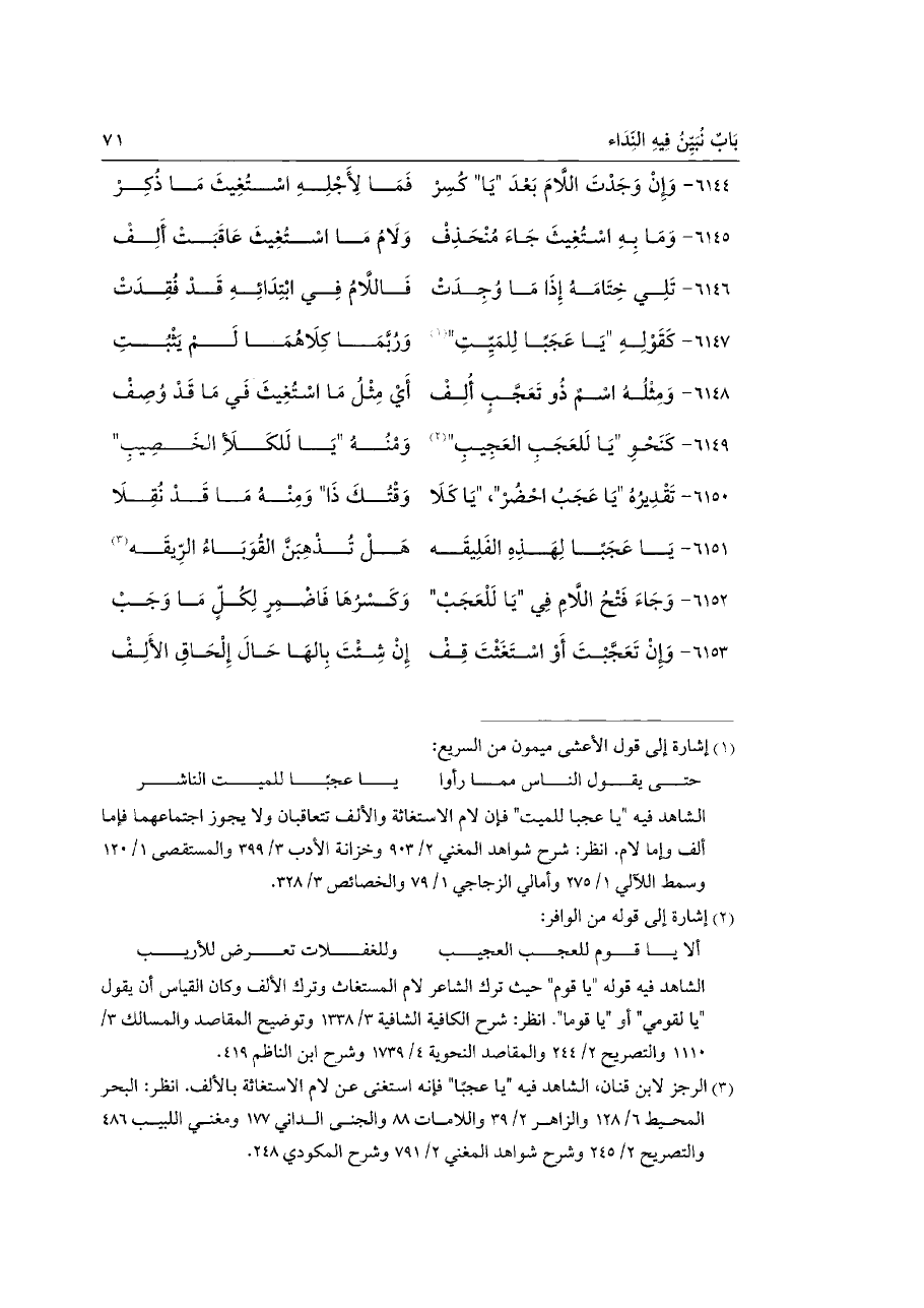 (¬٣) الرجز لابن قنان، الشاهد فيه "يا عجبًا" فإنه استغنى عن لام الاستغاثة بالألف. انظر: البحر المحيط ٦\ ١٢٨ والزاهر ٢\ ٣٩ واللامات ٨٨ والجنى الداني ١٧٧ ومغني اللبيب ٤٨٦ والتصريح ٢\ ٢٤٥ وشرح شواهد المغني ٢\ ٧٩١ وشرح المكودي ٢٤٨.