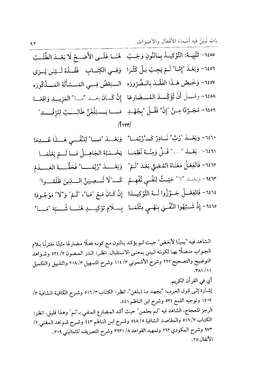 (¬٣) الرجز للعجاج، الشاهد فيه "لم يعلمن" حيث أكد المضارع المنفي بـ"لم" وهذا قليل. انظر: الكتاب ٣\ ٥١٦ والمقاصد الشافية ٥\ ٥٤٨ وشرح ابن الناظم ٤٤٣ وشرح شواهد المغني ٢\ ٩٧٣ وشرح المكودي ٢٦٢ وتمهيد القواعد ٨\ ٣٩٣١ وشرح التصريف للثمانيني ٣٠٩.