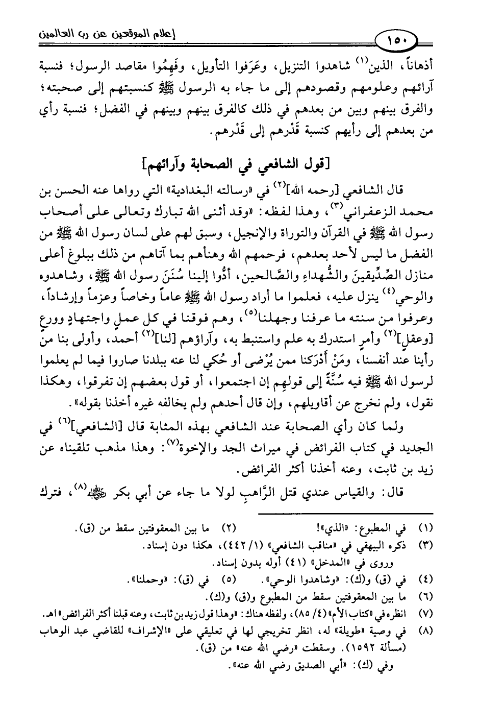 قال الشافعي [رحمه اللَّه] (٢) في "رسالته البغدادية" التي رواها عنه الحسن بن محمد الزعفراني (٣)، وهذا لفظه: "وقد أثنى اللَّه تبارك وتعالى على أصحاب رسول اللَّه -صلى اللَّه عليه وسلم- في القرآن والتوراة والإنجيل، وسبق لهم على لسان رسول اللَّه -صلى اللَّه عليه وسلم- من الفضل ما ليس لأحد بعدهم، فرحمهم اللَّه وهنأهم بما آتاهم من ذلك ببلوغ أعلى منازل الصِّدِّيقينَ والشُّهداءِ والصَّالحين، أدُّوا إلينا سُنَنَ رسول اللَّه -صلى اللَّه عليه وسلم-، وشاهدوه والوحي (٤) ينزل عليه، فعلموا ما أراد رسول اللَّه -صلى اللَّه عليه وسلم- عامًا وخاصًا وعزمًا وإرشادًا، وعرفوا من سنته ما عرفنا وجهلنا (٥)، وهم فوقنا في كل عملٍ واجتهادٍ وورعٍ [وعقلٍ] (٢) وأمرٍ استدرك به علم واستنبط به، وآراوْهم [لنا] (٢) أحمد، وأولى بنا من رأينا عند أنفسنا، ومَنْ أَدْرَكنا ممن يُرْضى أو حُكي لنا عنه ببلدنا صاروا فيما لم يعلموا لرسول اللَّه -صلى اللَّه عليه وسلم- فيه سُنَّةً إلى قولهِم إن اجتمعوا، أو قول بعضهم إن تفرقوا، وهكذا نقول، ولم نخرج عن أقاويلهم، وإن قال أحدهم ولم يخالفه غيره أخذنا بقوله".