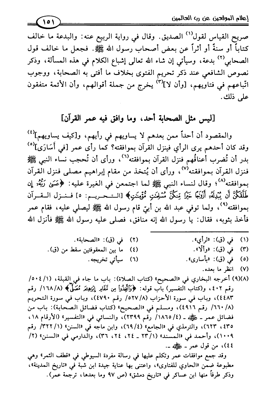 والمقصود أن أحدًا ممن بعدهم لا يساويهم في رأيهم، و [كيف يساويهم] (٤) وقد كان أحدهم يرى الرأي فينزل القرآن بموافقته؟ كما رأى عمر [في أَسَارَى] (٥) بدر أن تُضرب أعناقُهم فنزل القرآن بموافقته (٦)، ورأى أن تُحجب نساء النبي -صلى اللَّه عليه وسلم- فنزل القرآن بموافقته (٧)، ورأى أن يُتخذ من مقام إبراهيم مصلى فنزل القرآن بموافقته (٨)؛ وقال لنساء النبي -صلى اللَّه عليه وسلم- لما اجتمعن في الغيرة عليه: {عَسَى رَبُّهُ إِنْ طَلَّقَكُنَّ أَنْ يُبْدِلَهُ أَزْوَاجًا خَيْرًا مِنْكُنَّ مُسْلِمَاتٍ مُؤْمِنَاتٍ} [التحريم: ٥] فنزل القرآن بموافقته (٩)، ولما توفي عبد اللَّه بن أبيّ قام رسول اللَّه -صلى اللَّه عليه وسلم- ليصلي عليه، فقام عمر فأخذ بثوبه، فقال: يا رسول اللَّه إنه منافق، فصلى عليه رسول اللَّه -صلى اللَّه عليه وسلم- فأنزل اللَّه
