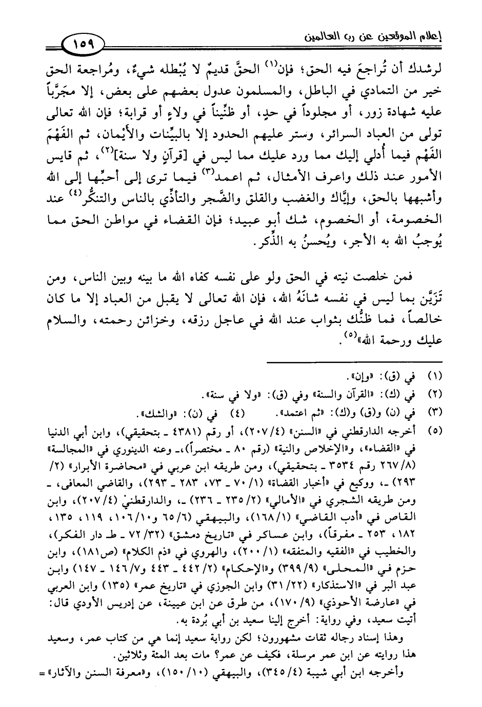 (٥) أخرجه الدارقطني في "السنن" (٤/ ٢٠٧)، أو رقم (٤٣٨١ - بتحقيقي)، وابن أبي الدنيا في "القضاء"، و"الإخلاص والنية" (رقم ٨٠ - مختصرًا)، -وعنه الدينوري في "المجالسة" (٨/ ٢٦٧ رقم ٣٥٣٤ - بتحقيقي)، ومن طريقه ابن عربي في "محاضرة الأبرار" (٢/ ٢٩٣) -، ووكيع في "أخبار القضاة" (١/ ٧٠ - ٧٣، ٢٨٣ - ٢٩٣)، والقاضي المعافى، -ومن طريقه الشجري في "الأمالي" (٢/ ٢٣٥ - ٢٣٦) -، والدارقطني (٤/ ٢٠٧)، وابن القاص في "أدب القاضي" (١/ ١٦٨)، والبيهقي (٦/ ٦٥ و ١٠/ ١٠٦، ١١٩، ١٣٥، ١٨٢، ٢٥٣ - مفرقًا)، وابن عساكر في "تاريخ دمشق" (٣٢/ ٧٢ - طـ دار الفكر)، والخطيب في "الفقيه والمتفقه" (١/ ٢٠٠)، والهروي في "ذم الكلام" (ص ١٨١)، وابن حزم في "المحلى" (٩/ ٣٩٩) و"الإِحكام" (٢/ ٤٤٢ - ٤٤٣ و ٧/ ١٤٦ - ١٤٧) وابن عبد البر في "الاستذكار" (٢٢/ ٣١) وابن الجوزي في "تاريخ عمر" (١٣٥) وابن العربي في "عارضة الأحوذي" (٩/ ١٧٠)، من طرق عن ابن عيينة، عن إدريس الأودي قال: أتيت سعيد، وفي رواية: أخرج إلينا سعبد بن أبي بُردة به.