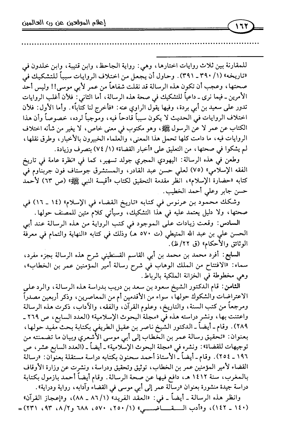 = للمقارنة بين ثلاث روايات اختارها، وهي: رواية الجاحظ، وابن قتيبة، وابن خلدون في "تاريخه" (١/ ٣٩٠ - ٣٩١). وحاول أن يجعل من اختلاف الروايات سببًا للتشكيك في صحتها، وعجب أن تكون هذه الرسالة قد نقلت شفاهًا من عمر لأبي موسى!! وليس أحد الأمرين -فيما نرى- داعيًا للتشكيك في صحة هذه الرسالة، أما الثاني: فلأن أغلب الروايات تدور على سعيد بن أبي بردة، وفيها يقول الراوي عنه: "فأخرج لنا كتابًا". وأما الأول: فلأن اختلاف الروايات في الحديث لا يكون سببًا قادحًا فيه، وموجبًا لرده، خصوصًا وأن هذا الكتاب عن عمر لا عن الرسول -صلى اللَّه عليه وسلم-، وهو مكتوب في معنى خاص، لا يغير من شأنه اختلاف الروايات فيه، ما دامت كلها تحمل هذا المعنى، والعلماء الخبيرون بالأخبار، وطرق نقلها، لم يشكوا في صحتها، من التعليق على "أخبار القضاة" (١/ ٧٤) بتصرف وزيادة.