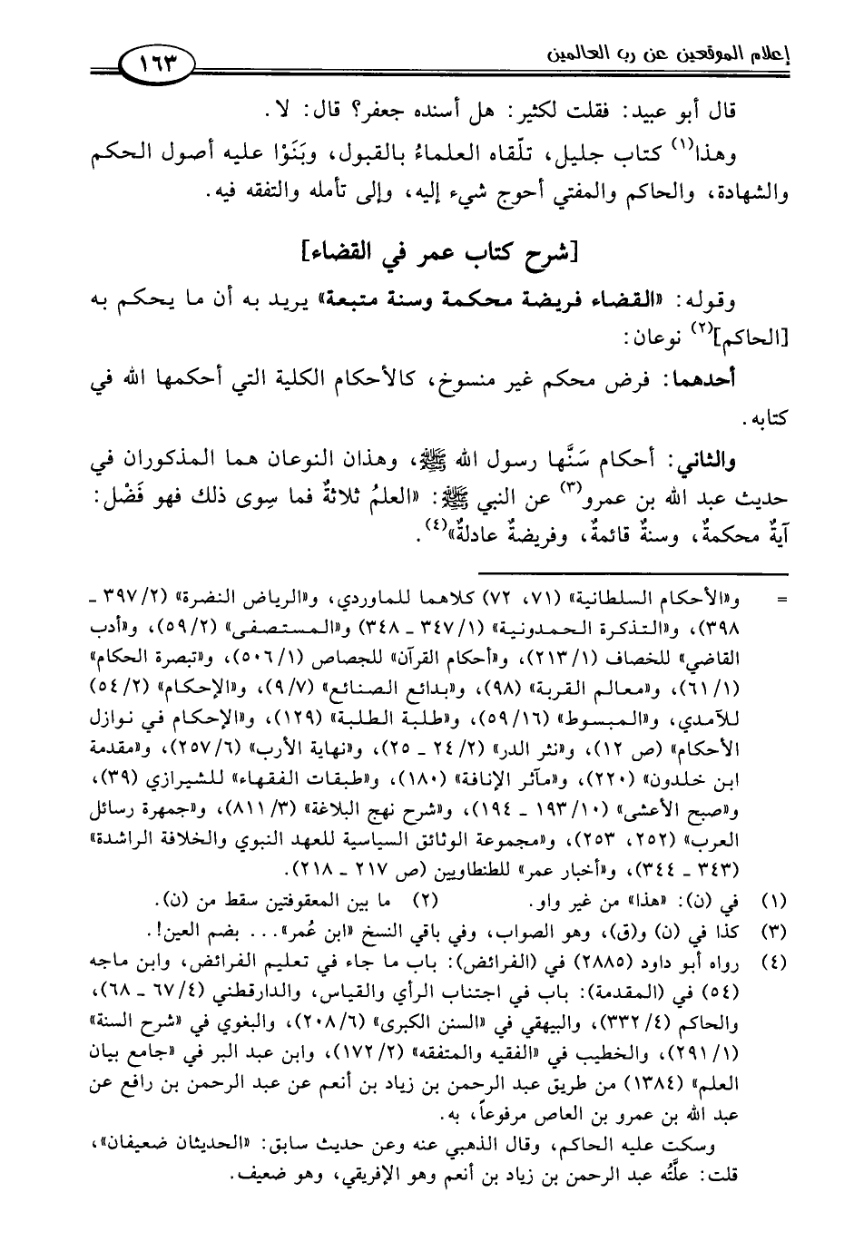 والثاني: أحكام سَنَّها رسول اللَّه -صلى اللَّه عليه وسلم-، وهذان النوعان هما المذكوران في حديث عبد اللَّه بن عمرو (٣) عن النبي -صلى اللَّه عليه وسلم-: "العلمُ ثلاثةٌ فما سِوى ذلك فهو فَضْل: آيةٌ محكمةٌ، وسنةٌ قائمةٌ، وفريضةٌ عادلةٌ" (٤).