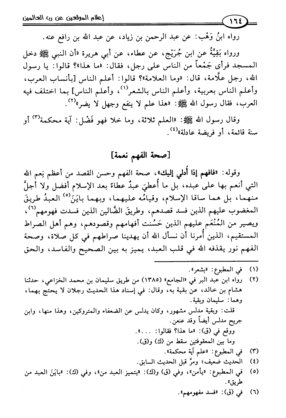 ورواه بَقِيَّةُ عن ابن جُرَيْج، عن عطاء، عن أبي هريرة "أن النبي -صلى اللَّه عليه وسلم- دخل المسجد فرأى جَمْعًا من الناس على رجل، فقال: "ما هذا"؟ قالوا: يا رسول اللَّه، رجل علَّامة، قال: "وما العلامة"؟ قالوا: أعلم الناس [بأنساب العرب، وأعلم الناس بعربية، وأعلم الناس بالشعر (١)، وأعلم الناس] بما اختلف فيه العرب، فقال رسول اللَّه -صلى اللَّه عليه وسلم-: "هذا علم لا ينفع وجهل لا يضر" (٢).