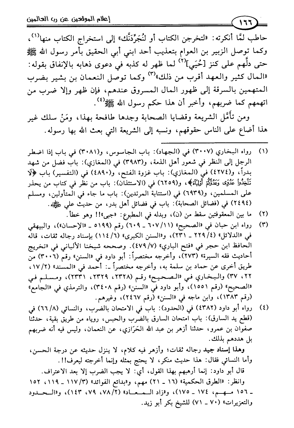 حاطب لمَّا أنكرته: "لتخرجن الكتاب أو لنُجَرِّدَنَّك" إلى استخراج الكتاب منها (١)، وكما توصل الزبير بن العوام بتعذيب أحد ابني أبي الحقيق بأمر رسول اللَّه -صلى اللَّه عليه وسلم- حتى دلَّهم على كنز [حُيَي] (٢) لما ظهر له كذبه في دعوى ذهابه بالإنفاق بقوله: "المال كثير والعهد أقرب من ذلك" (٣) وكما توصل النعمان بن بشير بضرب المتهمين بالسرقة إلى ظهور المال المسروق عندهم، فإن ظهر وإلا ضرب من اتهمهم كما ضربهم، وأخبر أن هذا حكم رسول اللَّه -صلى اللَّه عليه وسلم- (٤).