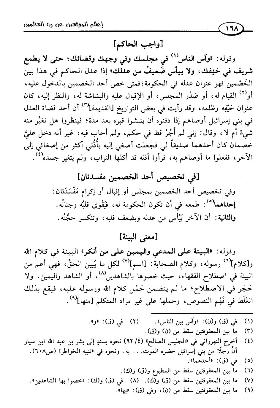 وقوله: "وآس الناس (١) في مجلسك وفي وجهك وقضائك، حتى لا يطمع شريف في حَيْفك، ولا ييأس ضَعيفٌ من عدلك" إذا عدل الحاكم في هذا بين الخَصْمين فهو عنوان عدله في الحكومة، فمتى خص أحد الخصمين بالدخول عليه، أو (٢) القيام له، أو صَدْر المجلس، أو الإقبال عليه والبشاشة له، والنظر إليه، كان عنوان حَيْفِه وظلمه، وقد رأيت في بعض التواريخ [القديمة] (٣) أن أحد قضاة العدل في بني إسرائيل أوصاهم إذا دفنوه أن ينبشوا قبره بعد مدة، فينظروا هل تغيَّر منه شيءٌ أم لا، وقال: إني لم أَجُرْ قط في حكم، ولم أحاب فيه، غير أنه دخل عليَّ خصمان كان أحدهما صديقًا لي فجعلت أصغي إليه بأُذُني أكثر من إصغائي إلى الآخر، ففعلوا ما أوصاهم به، فرأوا أذنه قد أكلها التراب، ولم يتغير جسده (٤).