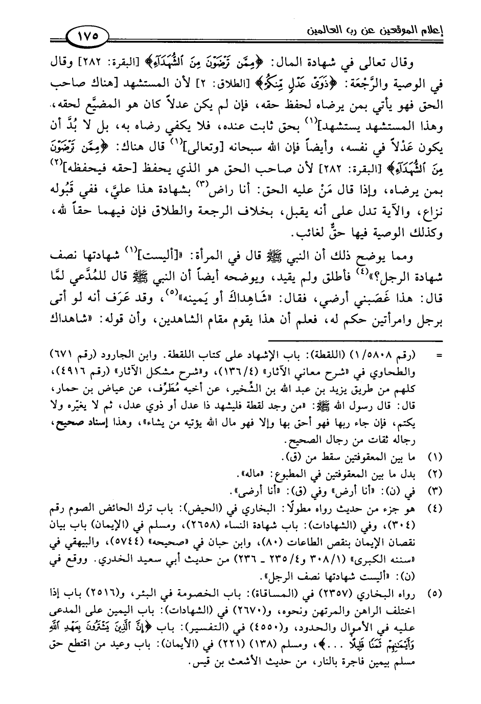 ومما يوضح ذلك أن النبي -صلى اللَّه عليه وسلم- قال في المرأة: " [أليست] (١) شهادتها نصف شهادة الرجل؟ " (٤) فأطلق ولم يقيد، ويوضحه أيضًا أن النبي -صلى اللَّه عليه وسلم- قال للمُدَّعي لمَّا قال: هذا غَصَبني أرضي، فقال: "شَاهِداكَ أو يَمينه" (٥)، وقد عَرَف أنه لو أتى برجل وامرأتين حكم له، فعلم أن هذا يقوم مقام الشاهدين، وأن قوله: "شاهداك
