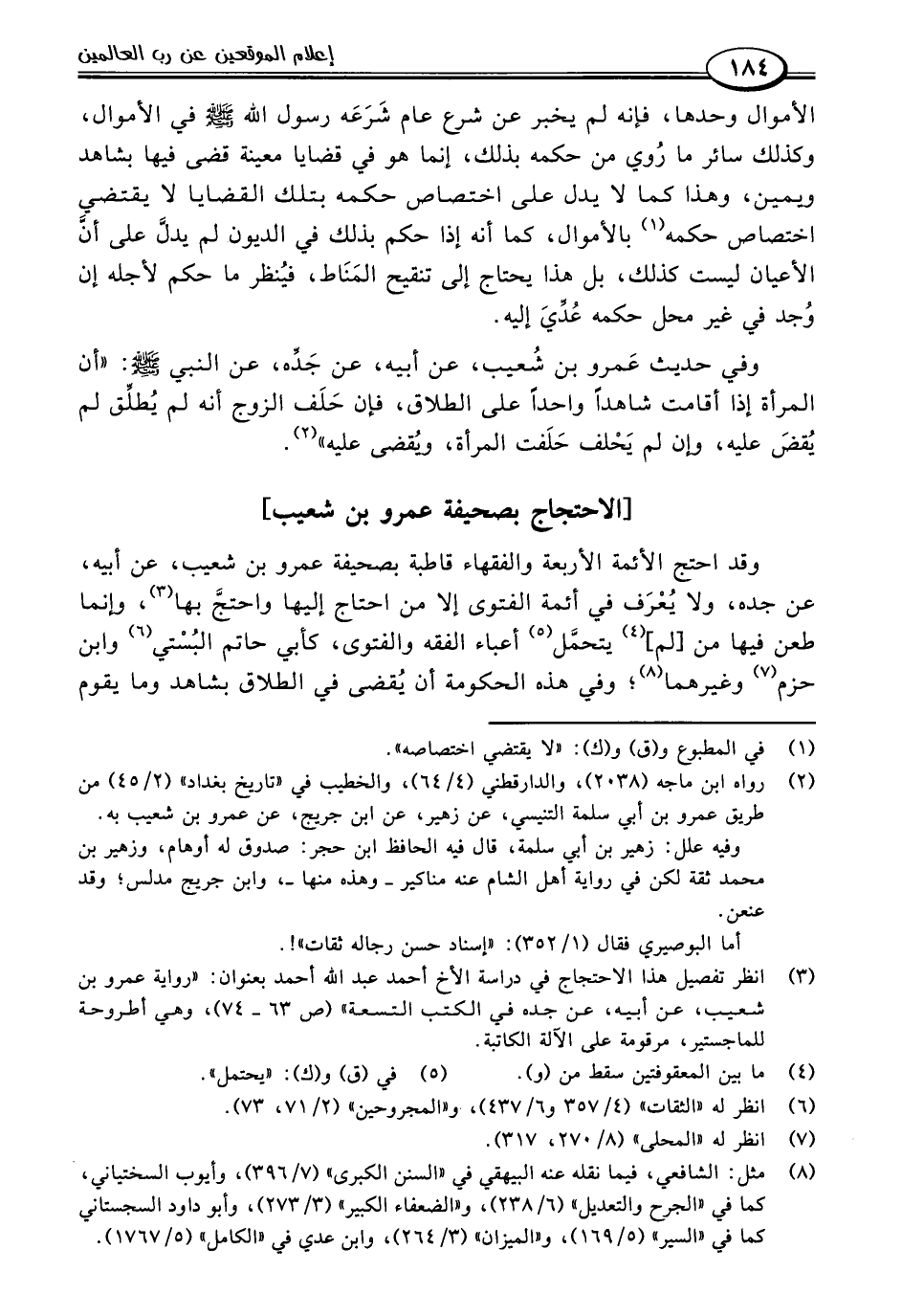 وقد احتج الأئمة الأربعة والفقهاء قاطبة بصحيفة عمرو بن شعيب، عن أبيه، عن جده، ولا يُعْرَف في أئمة الفتوى إلا من احتاج إليها واحتجَّ بها (٣)، وإنما طعن فيها من [لم] (٤) يتحمَّل (٥) أعباء الفقه والفتوى، كأبي حاتم البُسْتي (٦) وابن حزم (٧) وغيرهما (٨)؛ وفي هذه الحكومة أن يُقضى في الطلاق بشاهد وما يقوم