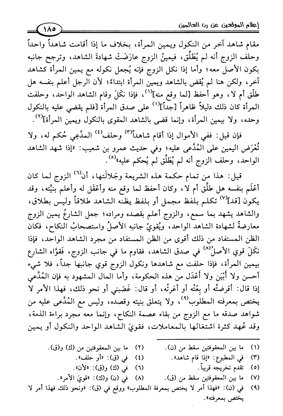 قيل: هذا من تمام حكمة هذه الشريعة وجَلالَتها، أن (٦) الزوج لما كان أعْلَم بنفسه هل طلَّق أم لا، وكان أحفظ لما وقع منه وأعْقَل له وأعلم بنيَّته، وقد يكون [قد] (٧) تكلم بلفظ مجمل أو بلفظ يظنه الشاهد طلاقًا وليس بطلاق، والشاهد يشهد بما سمع، والزوج أعلم بقصده ومراده، جعل الشارعُ يمين الزوج معارضةً لشهادة الشاهد الواحد، ويُقويّ جانبه الأصلُ واستصحابُ النكاح، فكان الظن المستفاد من ذلك أقوى من الظن المستفاد من مجرد الشاهد الواحد، فإذا نكَلَ قوي الأصلُ (٨) في صدق الشاهد، فقاوم ما في جانب الزوج، فَقوَّاه الشارع بيمين المرأة، فإذا حلفت مع شاهدها ونكول الزوج قوي جانبها جدًّا، فلا شيء أحسن ولا أَبْيَن ولا أَعْدَل من هذه الحكومة، وأما المال المشهود به فإن المُدَّعي إذا قال: أقرضتُه أو بِعْتُه أو أعَرتُه، أو قال: غَصَبني أو نحو ذلك، فهذا الأمر لا يختص بمعرفته المطلوب (٩)، ولا يتعلق بن يته وقصده، وليس مع المُدَّعى عليه من شواهد صدقه ما مع الزوج من بقاء عصمة النكاح، وإنما معه مجرد براءة الذمة، وقد عُهد كثرة اشتغالها بالمعاملات، فقويَ الشاهد الواحد والنكول أو يمين