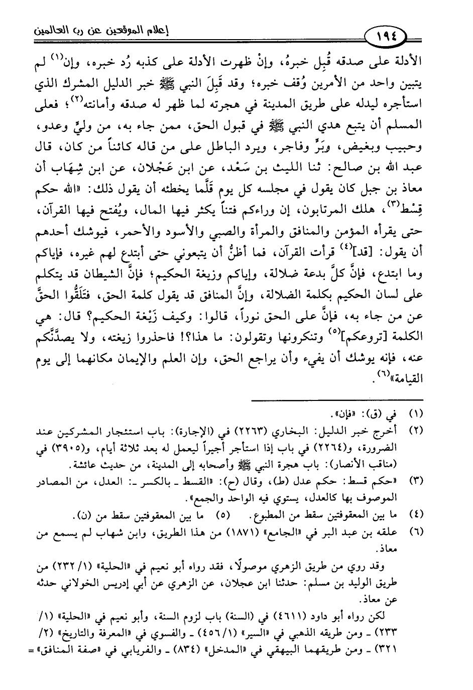 الأدلة على صدقه قُبِل خبرهُ، وإنْ ظهرت الأدلة على كذبه رُد خبره، وإن (١) لم يتبين واحد من الأمرين وُقف خبره؛ وقد قَبِلَ النبي -صلى اللَّه عليه وسلم- خبر الدليل المشرك الذي استأجره ليدله على طريق المدينة في هجرته لما ظهر له صدقه وأمانته (٢)؛ فعلى المسلم أن يتبع هدي النبي -صلى اللَّه عليه وسلم- في قبول الحق، ممن جاء به، من وليٍّ وعدو، وحبيب وبغيض، وبَرٍّ وفاجر، ويرد الباطل على من قاله كائنًا من كان، قال عبد اللَّه بن صالح: ثنا الليث بن سَعْد، عن ابن عَجْلان، عن ابن شِهَاب أن معاذ بن جبل كان يقول في مجلسه كل يوم قَلَّما يخطئه أن يقول ذلك: "اللَّه حكم قِسْط (٣)، هلك المرتابون، إن وراءكم فتنًا يكثر فيها المال، ويُفتح فيها القرآن، حتى يقرأه المؤمن والمنافق والمرأة والصبي والأسود والأحمر، فيوشك أحدهم أن يقول: [قد] (٤) قرأت القرآن، فما أظنُّ أن يتبعوني حتى أبتدع لهم غيره، فإياكم وما ابتدع، فإنَّ كلَّ بدعة ضلالة، وإياكم وزيغة الحكيم؛ فإنَّ الشيطان قد يتكلم على لسان الحكيم بكلمة الضلالة، وإنَّ المنافق قد يقول كلمة الحق، فتَلَقُّوا الحقَّ عن من جاء به، فإنَّ على الحق نورًا، قالوا: وكيف زَيْغة الحكيم؟ قال: هي الكلمة [تروعكم] (٥) وتنكرونها وتقولون: ما هذا؟! فاحذروا زيغته، ولا يصدَّنَّكم عنه، فإنه يوشك أن يفيء وأن يراجع الحق، وإن العلم والإيمان مكانهما إلى يوم القيامة" (٦).