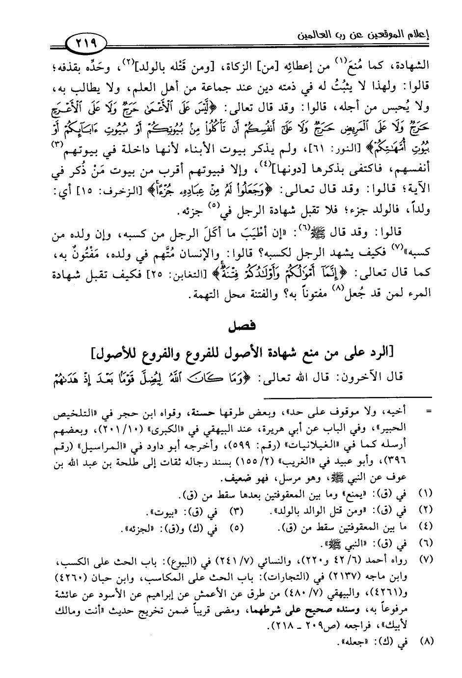 الشهادة، كما مُنعَ (١) من إعطائِه [من] الزكاة، [ومن قَتْله بالولد] (٢)، وحَدِّه بقذفه؛ قالوا: ولهذا لا يثبُتُ له في ذمته دين عند جماعة من أهل العلم، ولا يطالب به، ولا يُحبس من أجله، قالوا: وقد قال تعالى: {لَيْسَ عَلَى الْأَعْمَى حَرَجٌ وَلَا عَلَى الْأَعْرَجِ حَرَجٌ وَلَا عَلَى الْمَرِيضِ حَرَجٌ وَلَا عَلَى أَنْفُسِكُمْ أَنْ تَأْكُلُوا مِنْ بُيُوتِكُمْ أَوْ بُيُوتِ آبَائِكُمْ أَوْ بُيُوتِ أُمَّهَاتِكُمْ} [النور: ٦١]، ولم يذكر بيوت الأبناء لأنها داخلة في بيوتهم (٣) أنفسهم، فاكتفى بذكرها [دونها] (٤)، وإلا فبيوتهم أقرب من بيوت مَنْ ذُكر في الآية؛ قالوا: وقد قال تعالى: {وَجَعَلُوا لَهُ مِنْ عِبَادِهِ جُزْءًا} [الزخرف: ١٥] أي: ولدًا، فالولد جزء؛ فلا تقبل شهادة الرجل في (٥) جزئه.