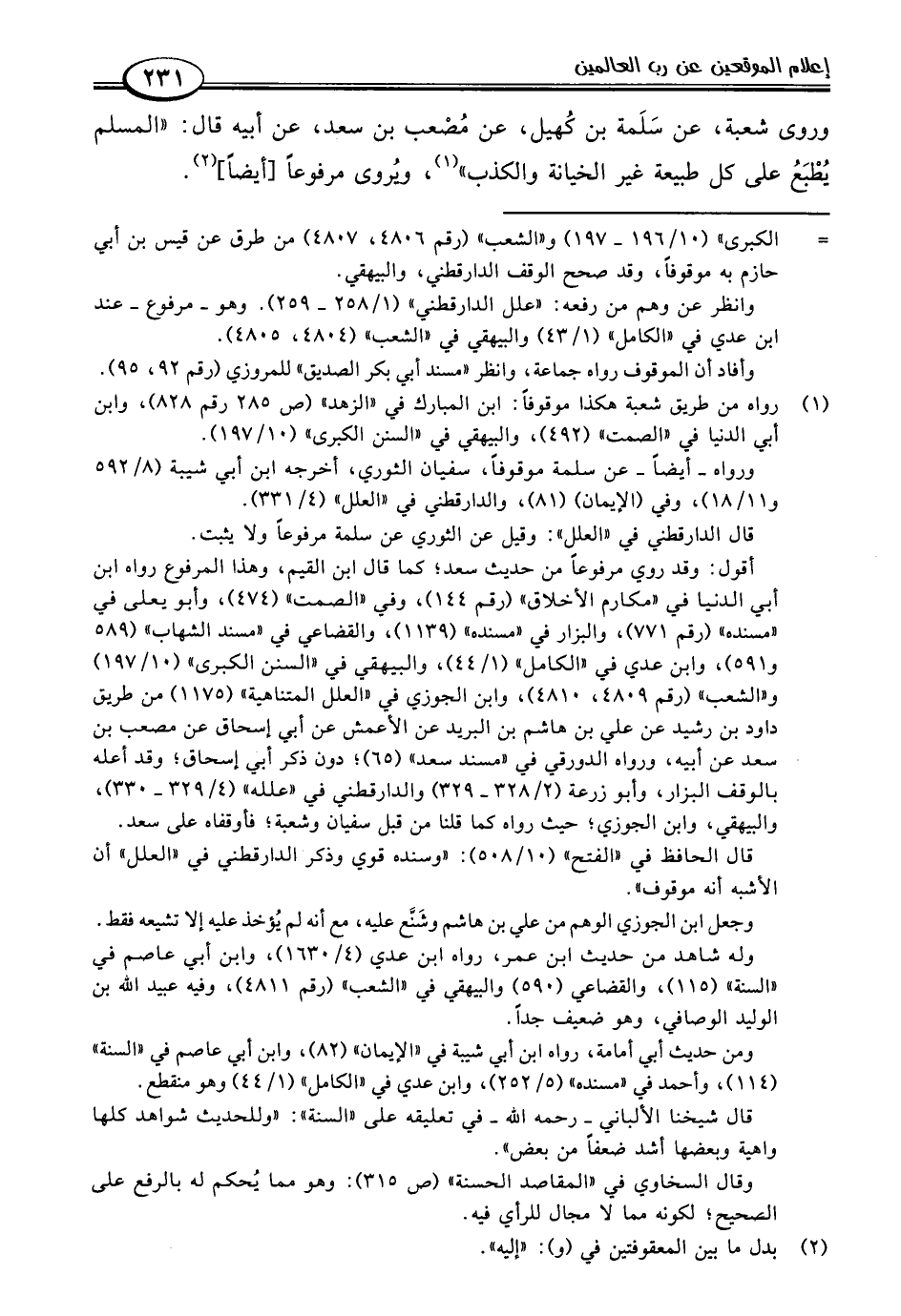 أقول: وقد روي مرفوعًا من حديث سعد؛ كما قال ابن القيم، وهذا المرفوع رواه ابن أبي الدنيا في "مكارم الأخلاق" (رقم ١٤٤)، وفي "الصمت" (٤٧٤)، وأبو يعلى في "مسنده" (رقم ٧٧١)، والبزار في "مسنده" (١١٣٩)، والقضاعي في "مسند الشهاب" (٥٨٩ و ٥٩١)، وابن عدي في "الكامل" (١/ ٤٤)، والبيهقي في "السنن الكبرى" (١٠/ ١٩٧) و"الشعب" (رقم ٤٨٠٩، ٤٨١٠)، وابن الجوزي في "العلل المتناهية" (١١٧٥) من طريق داود بن رشيد عن علي بن هاشم بن البريد عن الأعمش عن أبي إسحاق عن مصعب بن سعد عن أبيه، ورواه الدورقي في "مسند سعد" (٦٥)؛ دون ذكر أبي إسحاق؛ وقد أعله بالوقف البزار، وأبو زرعة (٢/ ٣٢٨ - ٣٢٩) والدارقطني في "علله" (٤/ ٣٢٩ - ٣٣٠)، والبيهقي، وابن الجوزي؛ حيث رواه كما قلنا من قبل سفيان وشعبة؛ فأوقفاه على سعد.