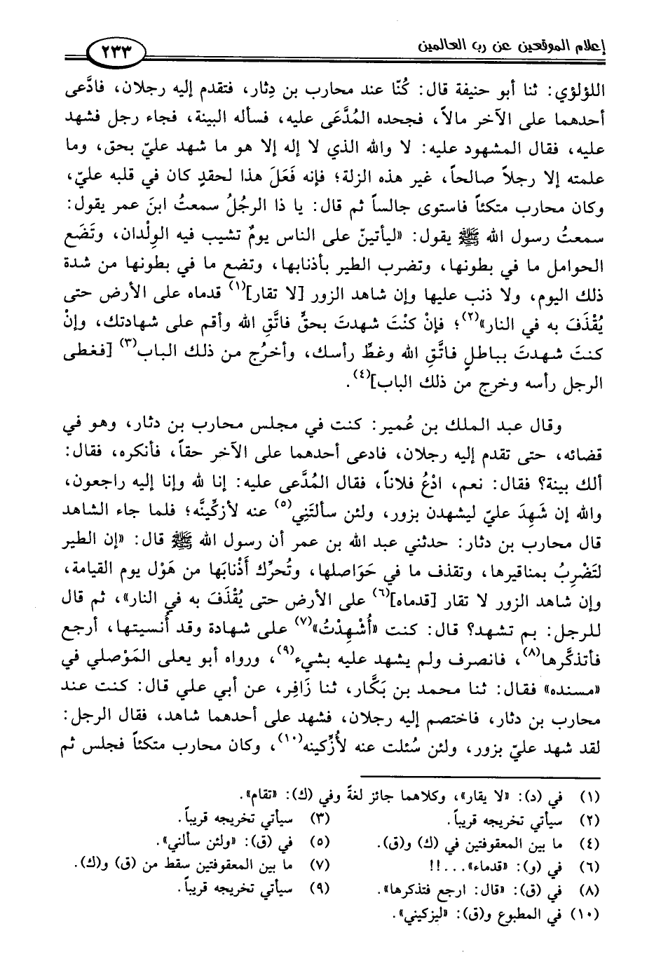 اللؤلؤي: ثنا أبو حنيفة قال: كُنّا عند محارب بن دِثار، فتقدم إليه رجلان، فادَّعى أحدهما على الآخر مالًا، فجحده المُدَّعَى عليه، فسأله البينة، فجاء رجل فشهد عليه، فقال المشهود عليه: لا واللَّه الذي لا إله إلا هو ما شهد عليّ بحق، وما علمته إلا رجلًا صالحًا، غير هذه الزلة؛ فإنه فَعَلَ هذا لحقدٍ كان في قلبه عليّ، وكان محارب متكئًا فاستوى جالسًا ثم قال: يا ذا الرجُلُ سمعتُ ابنَ عمر يقول: سمعتُ رسول اللَّه -صلى اللَّه عليه وسلم- يقول: "ليأتينّ على الناس يومٌ تشيب فيه الوِلْدان، وتَضَع الحوامل ما في بطونها، وتضرب الطير بأذنابها، وتضع ما في بطونها من شدة ذلك اليوم، ولا ذنب عليها وإن شاهد الزور [لا تقار] (١) قدماه على الأرض حتى يُقْذَفَ به في النار" (٢)؛ فإنْ كنْتَ شهدتَ بحقِّ فاتَّقِ اللَّه وأقم على شهادتك، وإنْ كنتَ شهدتَ بباطلٍ فاتَقِ اللَّه وغطِّ رأسك، وأخرُج من ذلك الباب (٣) [فغطى الرجل رأسه وخرج من ذلك الباب] (٤).