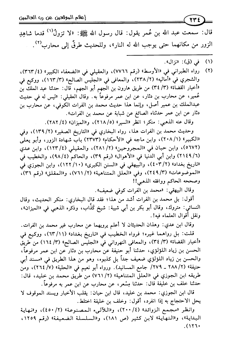 (٢) رواه الطبراني في "الأوسط" (رقم ٧٧٦٦)، والعقيلي في "الضعفاء الكبير" (٤/ ٣٦٣)، والشجري في "أماليه" (٢/ ٢٣٨)، والمعافى في "الجليس الصالح" (٣/ ١٦٣)، ووكيع في "أخبار القضاة" (٣/ ٣٤) من طريق هارون بن الجهم أبو الجهم، قال: حدثنا عبد الملك بن عُمير، عن محارب بن دثار، عن ابن عمر مرفوعًا به. وقال العقيلي: "ليس له في حديث عبد الملك بن عمير أصل، وإنما هذا حديث محمد بن الفرات الكوفي، عن محارب بن دثار عن ابن عمر حدثناه الصائغ عن شبابة عن محمد بن الفرات".