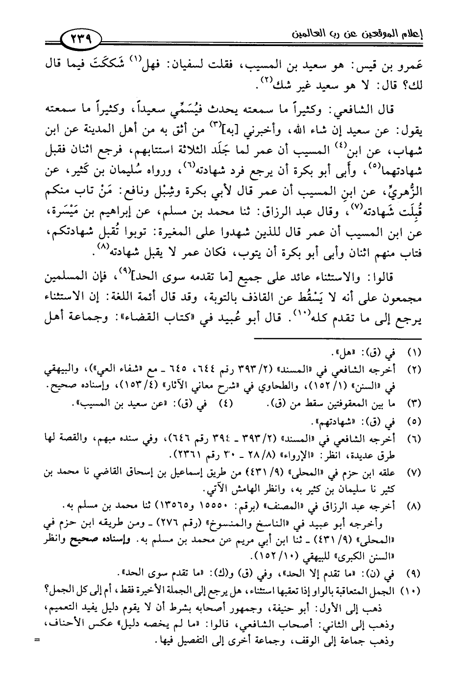 قال الشافعي: وكثيرًا ما سمعته يحدث فيُسَمِّي سعيدًا، وكثيرًا ما سمعته يقول: عن سعيد إن شاء اللَّه، وأخبرني [به] (٣) من أثق به من أهل المدينة عن ابن شهاب، عن ابن (٤) المسيب أن عمر لما جَلَد الثلاثة استتابهم، فرجع اثنان فقبل شهادتهما (٥)، وأبى أبو بكرة أن يرجع فرد شهادته (٦)، ورواه سُليمان بن كَثير، عن الزُّهريِّ، عن ابنِ المسيب أن عمر قال لأبي بكرة وشِبْل ونافع: مَنْ تاب منكم قُبِلَت شَهادته (٧)، وقال عبد الرزاق: ثنا محمد بن مسلم، عن إبراهيم بن مَيْسَرة، عن ابن المسيب أن عمر قال للذين شهدوا على المغيرة: توبوا تُقبل شهادتكم، فتاب منهم اثنان وأبى أبو بكرة أن يتوب، فكان عمر لا يقبل شهادته (٨).