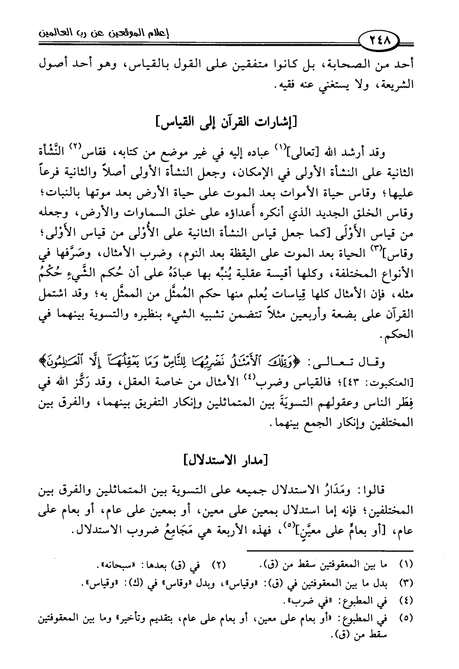 وقد أرشد اللَّه [تعالى] (١) عباده إليه في غير موضع عن كتابه، فقاس (٢) النَّشْأة الثانية على النشأة الأولى في الإمكان، وجعل النشأة الأولى أصلًا والثانية فرعًا عليها؛ وقاس حياة الأموات بعد الموت على حياة الأرض بعد موتها بالنبات؛ وقاس الخلق الجديد الذي أنكره أَعداؤه على خلق السماوات والأرض، وجعله من قياس الأَوْلَى [كما جعل قياس النشاة الثانية على الأُوْلى من قياس الأَوْلى؛ وقاس] (٣) الحياة بعد الموت على اليقظة بعد النوم، وضرب الأمثال، وصَرَّفها في الأنواع المختلفة، وكلها أقيسة عقلية يُنبِّه بها عبادَهُ على أن حُكم الشَّيءِ حُكْمُ مثله، فإن الأمثال كلها قِياسات يُعلم منها حكم المُمثَّل عن الممثَّل به؛ وقد اشتمل القرآن على بضعة وأربعين مثلًا تتضمن تشبيه الشيء بنظيره والتسوية بينهما في الحكم.