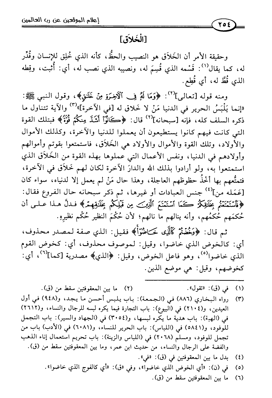 ومنه قوله [تعالى] (٢): {وَمَا لَهُ فِي الْآخِرَةِ مِنْ خَلَاقٍ}، وقول النبي -صلى اللَّه عليه وسلم-: "إنما يَلْبَسُ الحرير في الدنيا مَنْ لا خَلاق له [في الآخرة] " (٣) والآية تتناول ما ذكره السلف كله، فإنه [سبحانه] (٢) قال: {كَانُوا أَشَدَّ مِنْكُمْ قُوَّةً} فبتلك القوة التي كانت فيهم كانوا يستطيعون أن يعملوا للدنيا والآخرة، وكذلك الأموال والأولاد، وتلك القوة والأموال والأولاد هي الخَلَاق، فاستمتعوا بقوتهم وأموالهم وأولادهم في الدنيا، ونفس الأعمال التي عملوها بهذه القوة من الخَلَاق الذي استمتعوا به، ولو أرادوا بذلك اللَّه والدارَ الآخرة لكان لهم خَلَاق في الآخرة، فتمتُّعهم بها أخْذُ حظوظهم العاجلة، وهذا حال مَنْ لم يعمل إلا لدنياه، سواء كان [عَمَله من] (٤) جنس العبادات أو غيرها، ثم ذكر سبحانه حال الفروع فقال: {فَاسْتَمْتَعُوا بِخَلَاقِهِمْ فَاسْتَمْتَعْتُمْ بِخَلَاقِكُمْ كَمَا اسْتَمْتَعَ الَّذِينَ مِنْ قَبْلِكُمْ بِخَلَاقِهِمْ} فدلَّ هذا على أن حُكمَهم حُكمُهم، وأنه ينالهم ما نالهم؛ لأن حُكْمَ النظير حُكْم نظيرِهِ.