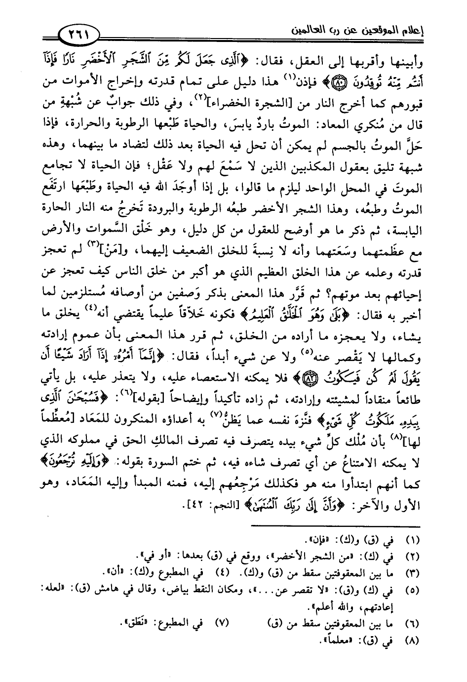 وأبينها وأقربها إلى العقل، فقال: {الَّذِي جَعَلَ لَكُمْ مِنَ الشَّجَرِ الْأَخْضَرِ نَارًا فَإِذَا أَنْتُمْ مِنْهُ تُوقِدُونَ (٨٠)} فإذن (١) هذا دليل على تمام قدرته وإخراج الأموات من قبورهم كما أخرج النار من [الشجرة الخضراء] (٢)، وفي ذلك جوابٌ عن شُبْهةِ من قال من مُنكري المعاد: الموتُ باردٌ يابسَ، والحياة طَبْعها الرطوبة والحرارة، فإذا حَل الموتُ بالجسم لم يمكن أن تحل فيه الحياة بعد ذلك لتضاد ما بينهما، وهذه شبهة تليق بعقول المكذبين الذين لا سَمْعَ لهم ولا عَقْل؛ فإن الحياة لا تجامع الموتَ في المحل الواحد ليلزم ما قالوا، بل إذا أوجَدَ اللَّه فيه الحياة وطَبْعَها ارتَفَع الموتُ وطبعُه، وهذا الشجر الأخضر طبعُه الرطوبة والبرودة تَخرجُ منه النار الحارة اليابسة، ثم ذكر ما هو أوضح للعقول من كل دليل، وهو خَلْق السَّموات والأرض مع عظَمتهما وسَعَتهما وأنه لا نِسبةَ للخلق الضعيف إليهما، و [مَنْ] (٣) لم تعجز قدرته وعلمه عن هذا الخلق العظيم الذي هو أكبر من خلق الناس كيف تعجز عن إحيائهم بعد موتهم؟ ثم قَرَّر هذا المعنى بذكر وَصفين من أوصافه مُستلزمين لما أخبر به فقال: {بَلَى وَهُوَ الْخَلَّاقُ الْعَلِيمُ} فكونه خَلاقًا عليمًا يقتضي أنه (٤) يخلق ما يشاء، ولا يعجزه ما أراده من الخلق، ثم قرر هذا المعنى بأن عموم إرادته وكمالها لا يَقْصر عنه (٥) ولا عن شيء أبدًا، فقال: {إِنَّمَا أَمْرُهُ إِذَا أَرَادَ شَيْئًا أَنْ يَقُولَ لَهُ كُنْ فَيَكُونُ (٨٢)} فلا يمكنه الاستعصاء عليه، ولا يتعذر عليه، بل يأتي طائعًا منقادًا لمشيئته وإرادته، ثم زاده تأكيدًا وإيضاحًا [بقوله] (٦): {فَسُبْحَانَ الَّذِي بِيَدِهِ مَلَكُوتُ كُلِّ شَيْءٍ} فنَّزهَ نفسه عما يَظنُّ (٧) به أعداؤه المنكرون للمَعَاد [مُعظِّمًا لها] (٨) بأن مُلْك كلِّ شيء بيده يتصرف فيه تصرف المالكِ الحق في مملوكه الذي لا يمكنه الامتناعُ عن أي تصرف شاءه فيه، ثم ختم السورة بقوله: {وَإِلَيْهِ تُرْجَعُونَ} كما أنهم ابتدأوا منه هو فكذلك مَرْجِعُهم إليه، فمنه المبدأ وإليه المَعَاد، وهو الأول والآخر: {وَأَنَّ إِلَى رَبِّكَ الْمُنْتَهَى} [النجم: ٤٢].