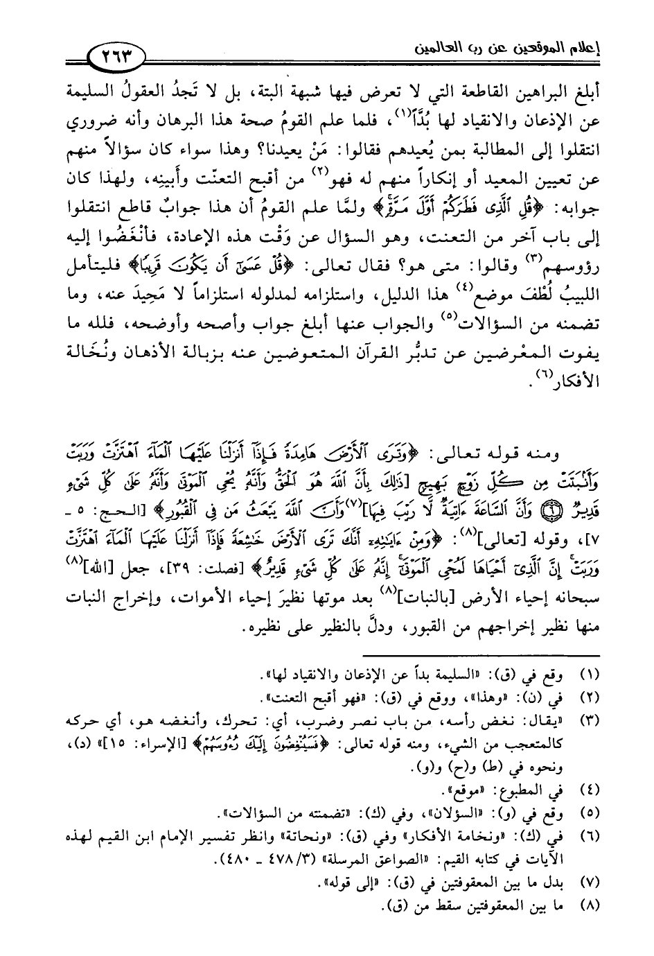 أبلغ البراهين القاطعة التي لا تعرض فيها شبهة البتة، بل لا تَجدُ العقولُ السليمة عن الإذعان والانقياد لها بُدًّا (١)، فلما علم القومُ صحة هذا البرهان وأنه ضروري انتقلوا إلى المطالبة بمن يُعيدهم فقالوا: مَنْ يعيدنا؟ وهذا سواء كان سؤالًا منهم عن تعيين المعيد أو إنكارًا منهم له فهو (٢) من أقبح التعنّت وأَبينِه، ولهذا كان جوابه: {قُلِ الَّذِي فَطَرَكُمْ أَوَّلَ مَرَّةٍ} ولمَّا علم القومُ أن هذا جوابٌ قاطع انتقلوا إلى باب آخر من التعنت، وهو السؤال عن وَقْت هذه الإعادة، فأنْغَضُوا إليه رؤوسهم (٣) وقالوا: متى هو؟ فقال تعالى: {قُلْ عَسَى أَنْ يَكُونَ قَرِيبًا} فليتأمل اللبيبُ لُطْفَ موضع (٤) هذا الدليل، واستلزامه لمدلوله استلزامًا لا مَحِيدَ عنه، وما تضمنه من السؤالات (٥) والجواب عنها أبلغ جواب وأصحه وأوضحه، فلله ما يفوت المعْرضين عن تدبُّر القرآن المتعوضين عنه بزبالة الأذهان ونُخَالة الأفكار (٦).