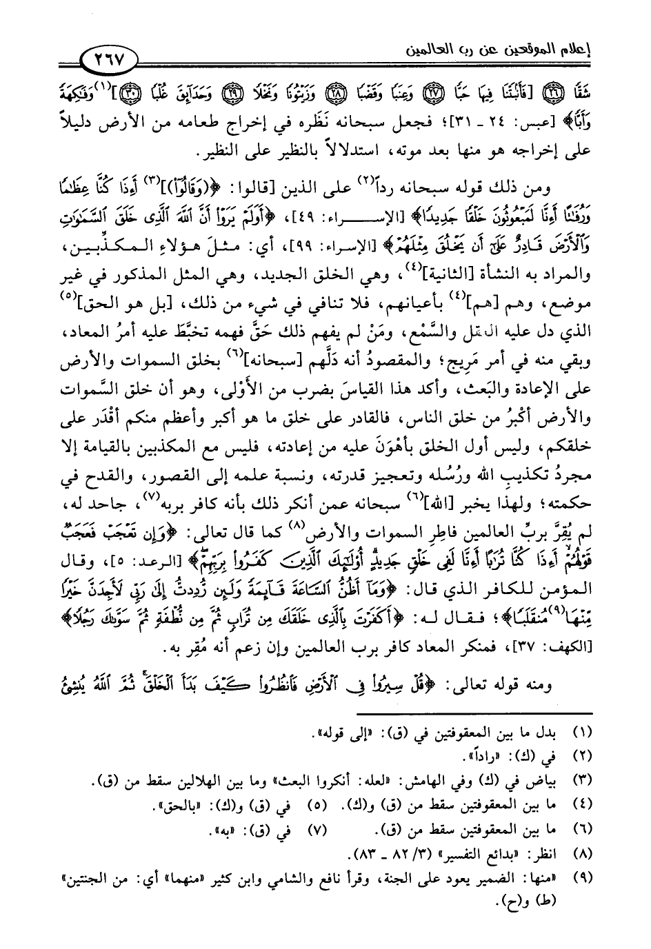 ومن ذلك قوله سبحانه ردًا (٢) على الذين [قالوا: {(وَقَالُوا)] (٣) أَإِذَا كُنَّا عِظَامًا وَرُفَاتًا أَإِنَّا لَمَبْعُوثُونَ خَلْقًا جَدِيدًا (٤٩)} [الإسراء: ٤٩]، {أَوَلَمْ يَرَوْا أَنَّ اللَّهَ الَّذِي خَلَقَ السَّمَاوَاتِ وَالْأَرْضَ قَادِرٌ عَلَى أَنْ يَخْلُقَ مِثْلَهُمْ} [الإسراء: ٩٩]، أي: مثلَ هؤلاءِ المكذِّبين، والمراد به النشأة [الثانية] (٤)، وهي الخلق الجديد، وهي المثل المذكور في غير موضع، وهم [هم] (٤) بأعيانهم، فلا تنافي في شيء من ذلك، [بل هو الحق] (٥) الذي دل عليه العقل والسَّمْع، ومَنْ لم يفهم ذلك حَق فهمه تخبَّطَ عليه أمرُ المعاد، وبقي منه في أمر مَرِيج؛ والمقصودُ أنه دَلَّهم [سبحانه] (٦) بخلق السموات والأرض على الإعادة والبَعث، وأكد هذا القياسَ بضرب من الأَوْلى، وهو أن خلق السَّموات والأرض أكْبرُ من خلق الناس، فالقادر على خلق ما هو أكبر وأعظم منكم أقْدَر على خلقكم، وليس أول الخلق بأهْوَنَ عليه من إعادته، فليس مع المكذبين بالقيامة إلا مجردُ تكذيب اللَّه ورُسُله وتعجيز قدرته، ونسبة علمه إلى القصور، والقدح في حكمته؛ ولهذا يخبر [اللَّه] (٦) سبحانه عمن أنكر ذلك بأنه كافر بربه (٧)، جاحد له، لم يُقِرَّ بربِّ العالمين فاطِرِ السموات والأرض (٨) كما قال تعالى: {وَإِنْ تَعْجَبْ فَعَجَبٌ قَوْلُهُمْ أَإِذَا كُنَّا تُرَابًا أَإِنَّا لَفِي خَلْقٍ جَدِيدٍ أُولَئِكَ الَّذِينَ كَفَرُوا بِرَبِّهِمْ} [الرعد: ٥]، وقال المؤمن للكافر الذي قال: {وَمَا أَظُنُّ السَّاعَةَ قَائِمَةً وَلَئِنْ رُدِدْتُ إِلَى رَبِّي لَأَجِدَنَّ خَيْرًا مِنْهَا (٩) مُنْقَلَبًا (٣٦)} [الكهف: ٣٦]؛ فقال له: {أَكَفَرْتَ بِالَّذِي خَلَقَكَ مِنْ تُرَابٍ ثُمَّ مِنْ نُطْفَةٍ ثُمَّ سَوَّاكَ رَجُلًا (٣٧)} [الكهف: ٣٧]، فمنكر المعاد كافر برب العالمين وإن زعم أنه مُقِر به.