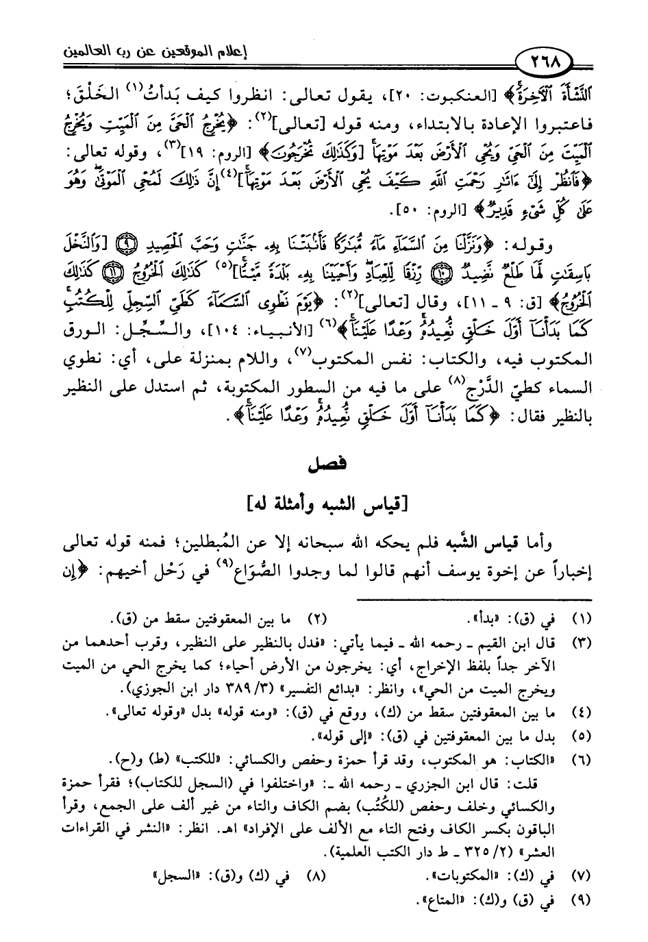 (٣) قال ابن القيم -رحمه اللَّه- فيما يأتي: "فدل بالنظير على النظير، وقرب أحدهما من الآخر جدًّا بلفظ الأخراج، أي: يخرجون من الأرض أحياء؛ كما يخرج الحي من الميت ويخرج الميت من الحي"، وانظر: "بدائع التفسير" (٣/ ٣٨٩ دار ابن الجوزي).
