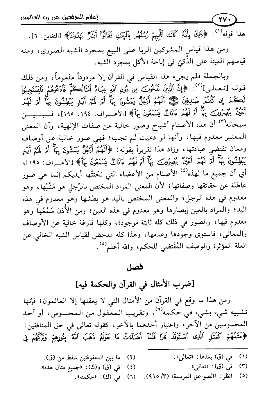 وبالجملة فلم يجئ هذا القياس في القرآن إلا مردودًا مذمومًا، ومن ذلك قوله [تعالى] (٢): {إِنَّ الَّذِينَ تَدْعُونَ مِنْ دُونِ اللَّهِ عِبَادٌ أَمْثَالُكُمْ فَادْعُوهُمْ فَلْيَسْتَجِيبُوا لَكُمْ إِنْ كُنْتُمْ صَادِقِينَ (١٩٤) أَلَهُمْ أَرْجُلٌ يَمْشُونَ بِهَا أَمْ لَهُمْ أَيْدٍ يَبْطِشُونَ بِهَا أَمْ لَهُمْ أَعْيُنٌ يُبْصِرُونَ بِهَا أَمْ لَهُمْ آذَانٌ يَسْمَعُونَ بِهَا} [الأعراف: ١٩٤، ١٩٥]، فبين سبحانه (٣) أن هذه الأصنام أشباح وصور خالية عن صفات الإلهية، وأن المعنى المعتبر معدوم فيها، وأنها لو دعيت لم تجب؛ فهي صور خالية عن أوصاف ومعان تقتضي عبادتها، وزاد هذا تقريرًا بقوله: {أَلَهُمْ أَرْجُلٌ يَمْشُونَ بِهَا أَمْ لَهُمْ أَيْدٍ يَبْطِشُونَ بِهَا أَمْ لَهُمْ أَعْيُنٌ يُبْصِرُونَ بِهَا أَمْ لَهُمْ آذَانٌ يَسْمَعُونَ بِهَا} [الأعراف: ١٩٥]، أي أن جميع ما لهذه (٤) الأصنام من الأعضاء التي نحَتتْها أيديكم إنما هي صور عاطلة عن حقائقها وصفاتها؛ لأن المعنى المراد المختص بالرِّجلِ هو مَشْيُها، وهو معدوم في هذه الرجل؛ والمعنى المختص باليد هو بطشها وهو معدوم في هذه اليد؛ والمراد بالعين إبصارها وهو معدوم في هذه العين؛ ومن الأُذن سَمْعُها وهو معدوم فيها، والصور في ذلك كله ثابتة موجودة، وكلها فارغة خالية عن الأوصاف والمعاني، فاستوى وجودها وعدمها، وهذا كله مدحض لقياس الشبه الخالي عن العلة المؤثرة والوصف المُقْتضي للحكم، واللَّه أعلم (٥).