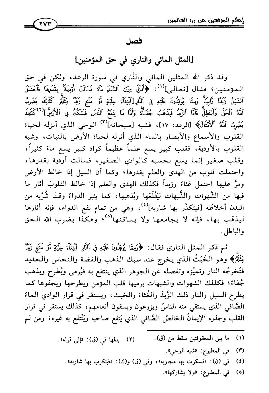 وقد ذكر اللَّه المثلين المائي والنَّاري في سورة الرعد، ولكن في حق المؤمنين؛ فقال [تعالى] (١): {أَنْزَلَ مِنَ السَّمَاءِ مَاءً فَسَالَتْ أَوْدِيَةٌ بِقَدَرِهَا فَاحْتَمَلَ السَّيْلُ زَبَدًا رَابِيًا وَمِمَّا يُوقِدُونَ عَلَيْهِ فِي النَّارِ [ابْتِغَاءَ حِلْيَةٍ أَوْ مَتَاعٍ زَبَدٌ مِثْلُهُ كَذَلِكَ يَضْرِبُ اللَّهُ الْحَقَّ وَالْبَاطِلَ فَأَمَّا الزَّبَدُ فَيَذْهَبُ جُفَاءً وَأَمَّا مَا يَنْفَعُ النَّاسَ فَيَمْكُثُ فِي الْأَرْضِ] (٢) كَذَلِكَ يَضْرِبُ اللَّهُ الْأَمْثَالَ (١٧)} [الرعد: ١٧]، فشبه [سبحانه] (٣) الوحي الذي أنزله لحياة القلوب والأسماع والأبصار بالماء الذي أنزله لحياة الأرض بالنبات، وشبه القلوب بالأودية، فقلب كبير يسع علمًا عظيمًا كواد كبير يسع ماءً كثيرًا، وقلب صغير إنما يسع بحسبه كالوادي الصغير، فسالت أودية بقدرها، واحتملت قلوب من الهدى والعلم بقدرها؛ وكما أن السيل إذا خالط الأرض ومرَّ عليها احتمل غثاءً وزبدًا فكذلك الهدى والعلم إذا خالط القلوبَ أثار ما فيها من الشَّهوات والشُّبهات ليَقْلَعَها ويُذهبها، كما يثير الدواءُ وقتَ شُرْبه من البدن أخلاطَه [فيتكدَّر بها شاربه] (٤)، وهي من تمام نفع الدواء، فإنه أثارها ليذهَب بها، فإنه لا يجامعها ولا يساكنها (٥)؛ وهكذا يضرب اللَّه الحق والباطل.