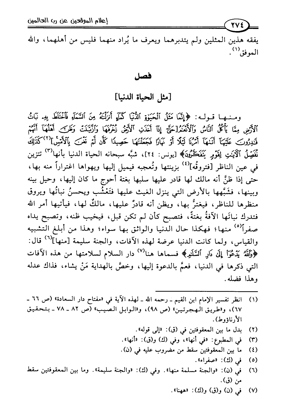 ومنها قوله: {إِنَّمَا مَثَلُ الْحَيَاةِ الدُّنْيَا كَمَاءٍ أَنْزَلْنَاهُ مِنَ السَّمَاءِ فَاخْتَلَطَ بِهِ نَبَاتُ الْأَرْضِ مِمَّا يَأْكُلُ النَّاسُ وَالْأَنْعَامُ [حَتَّى إِذَا أَخَذَتِ الْأَرْضُ زُخْرُفَهَا وَازَّيَّنَتْ وَظَنَّ أَهْلُهَا أَنَّهُمْ قَادِرُونَ عَلَيْهَا أَتَاهَا أَمْرُنَا لَيْلًا أَوْ نَهَارًا فَجَعَلْنَاهَا حَصِيدًا كَأَنْ لَمْ تَغْنَ بِالْأَمْسِ] (٢) كَذَلِكَ نُفَصِّلُ الْآيَاتِ لِقَوْمٍ يَتَفَكَّرُونَ (٢٤)} [يونس: ٢٤]، شبَّه سبحانه الحياة الدنيا بأنها (٣) تتزين في عين الناظر [فتروقُه] (٤) بزينتها وتُعجبه فيميل إليها ويهواها اغترارًا منه بها، حتى إذا ظنَّ أنه مالك لها قادر عليها سلبها بغتة أحوج ما كان إليها، وحيل بينه وبينها، فشَبَّهها بالأرض التي ينزل الغيث عليها فتَعْشُب ويحسنُ نباتُها ويروق منظرها للناظر، فيغتزُ بها، ويظن أنه قادرٌ عليها، مالكٌ لها، فيأتيها أمر اللَّه فتدرك نباتَها الآفةُ بغتةَ، فتصبح كأن لم تكن قبل، فيخيب ظنه، وتصبح يداه صفرًا (٥) منها؛ فهكذا حال الدنيا والواثق بها سواء؛ وهذا من أبلغ التشبيه والقياس، ولما كانت الدنيا عرضة لهذه الآفات، والجنة سليمة [منها] (٦) قال: {وَاللَّهُ يَدْعُو إِلَى دَارِ السَّلَامِ} فسماها هنا (٧) دار السلام لسلامتها من هذه الآفات التي ذكرها في الدنيا، فعمَّ بالدعوة إليها، وخصَّ بالهداية مَنْ يشاء، فذاك عدله وهذا فضله.